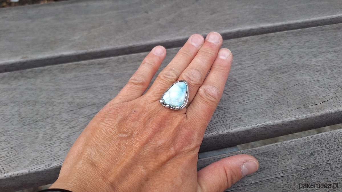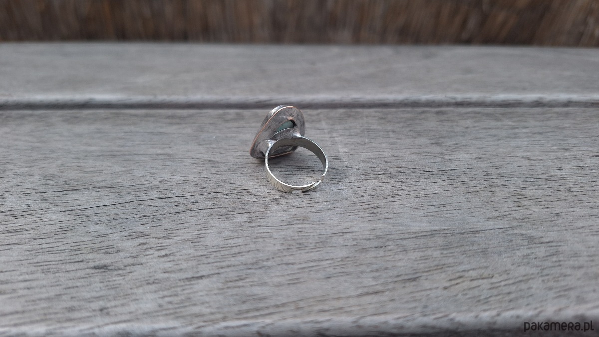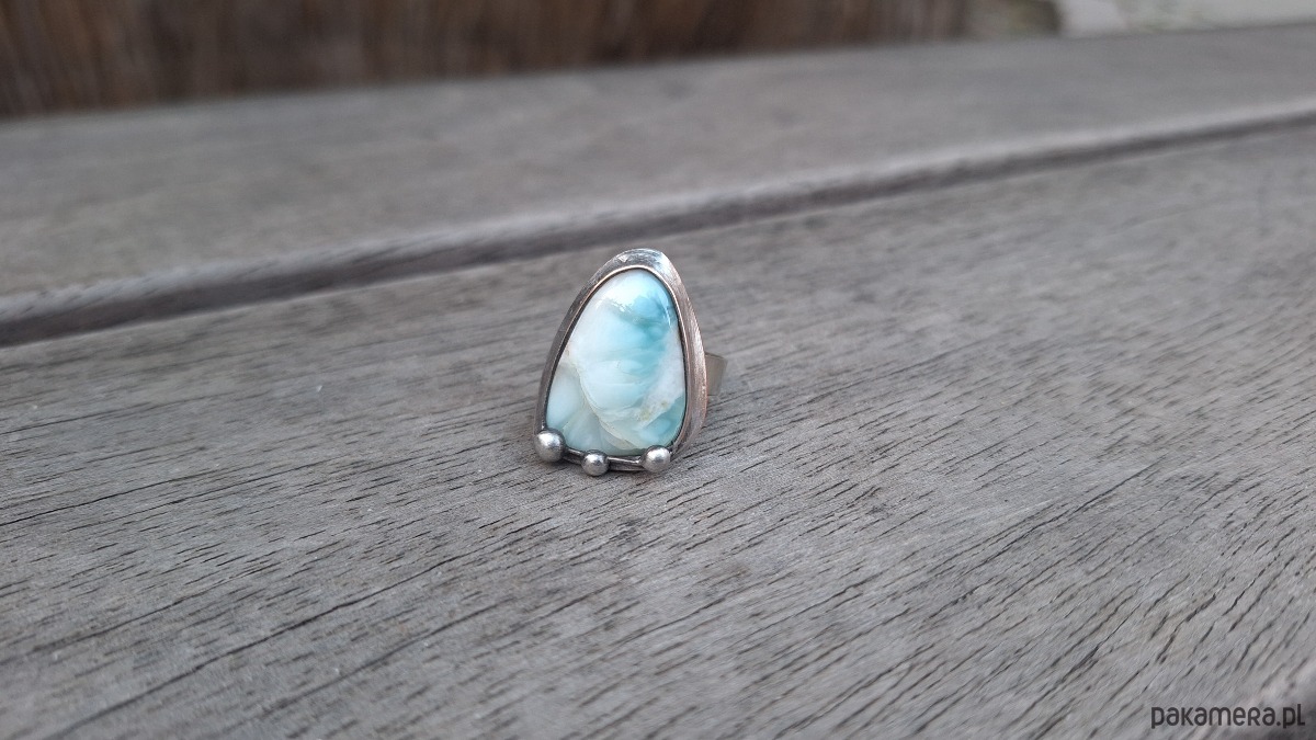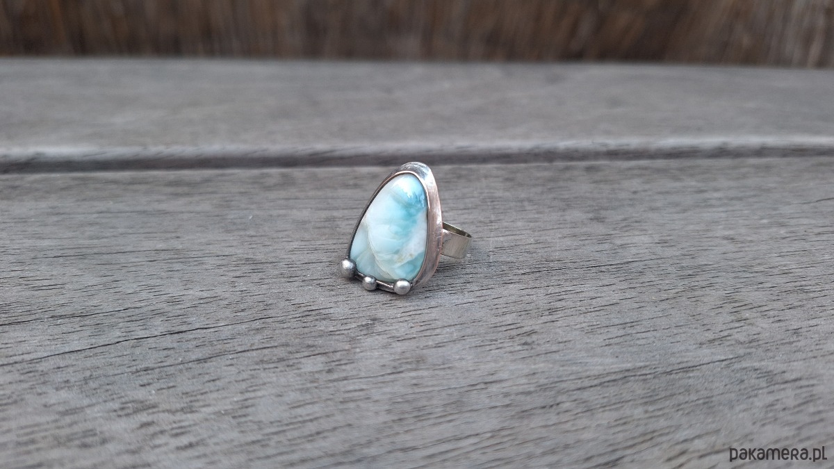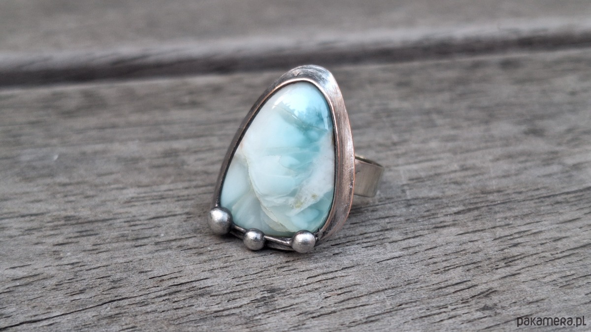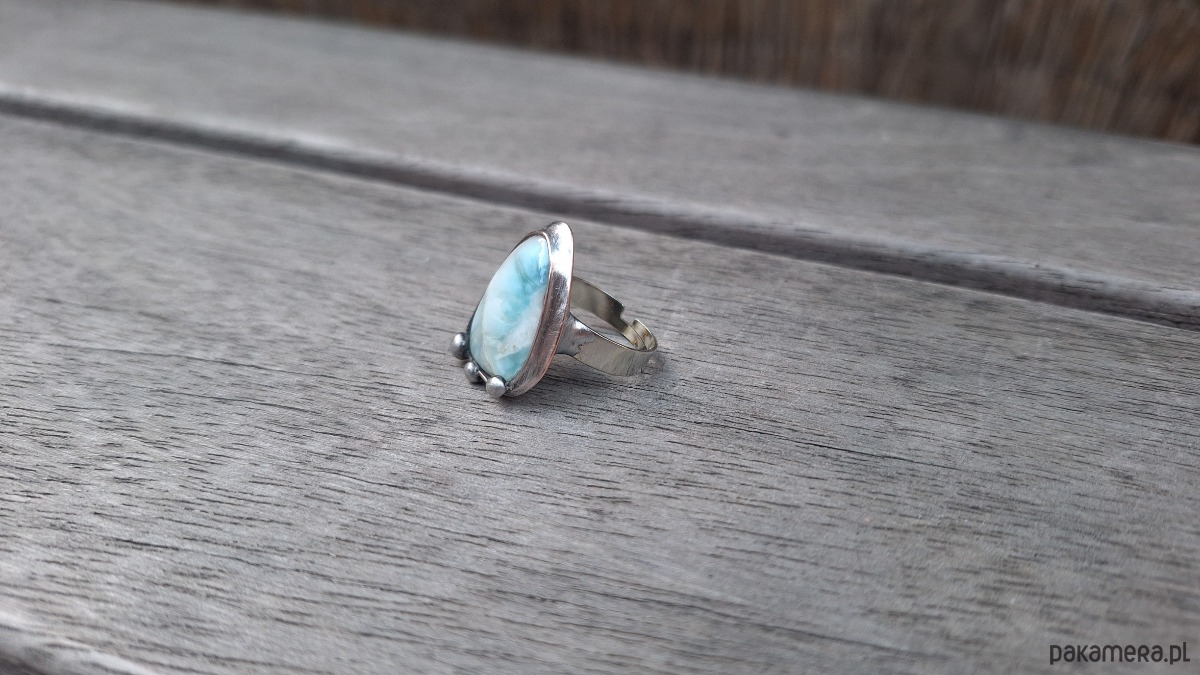 Pierścionek wykonany z miedzi, cyny i larimaru. Wymiary ok. 2.5 na 1.8 cm. Regulowany. Nie jest ciężki.