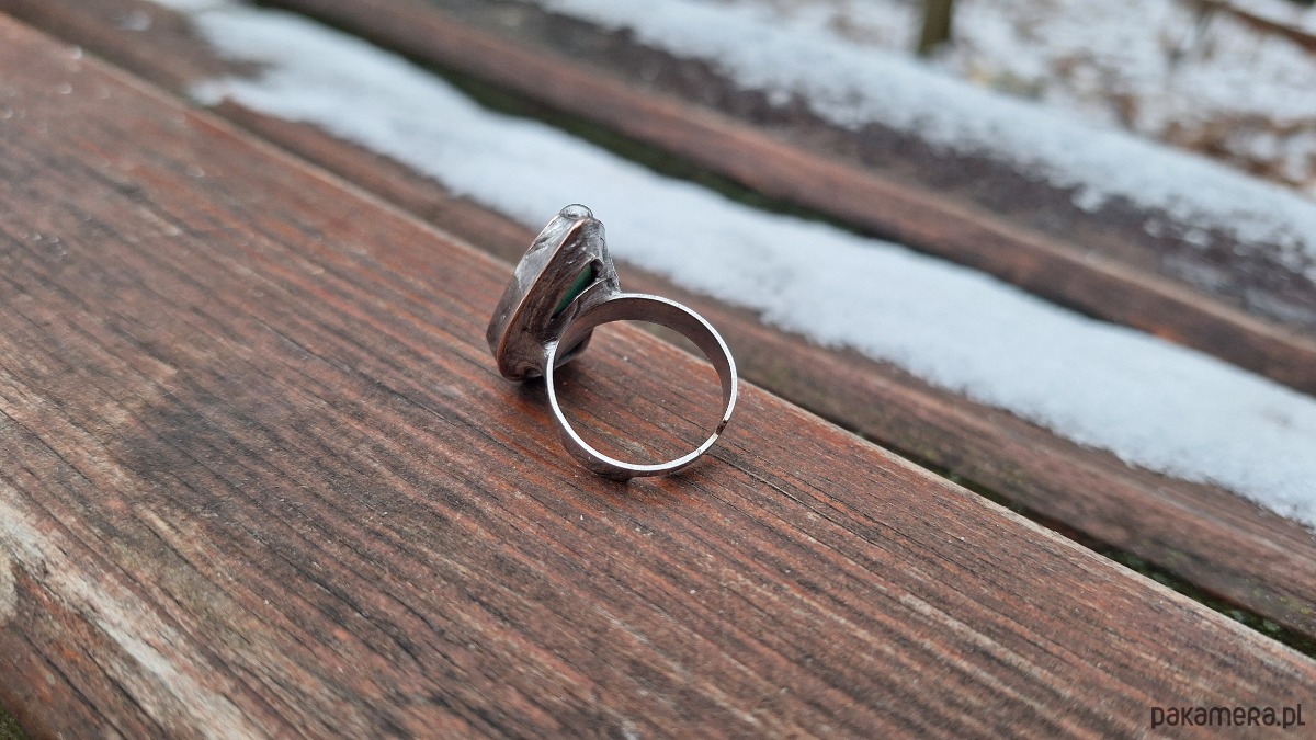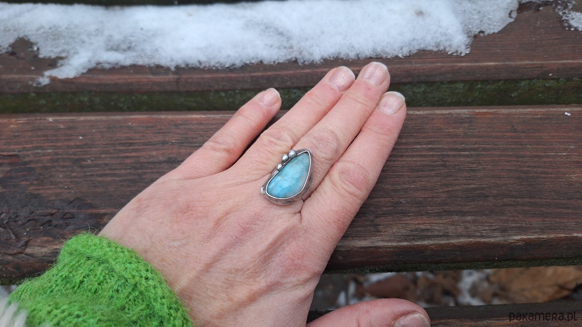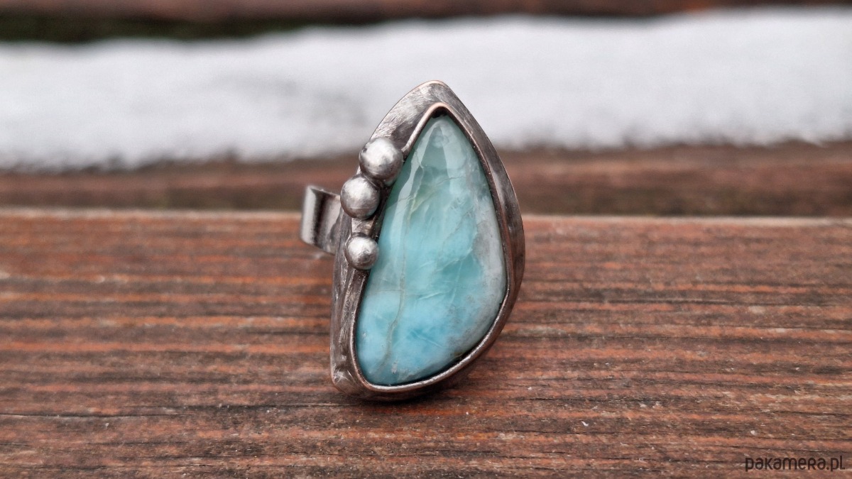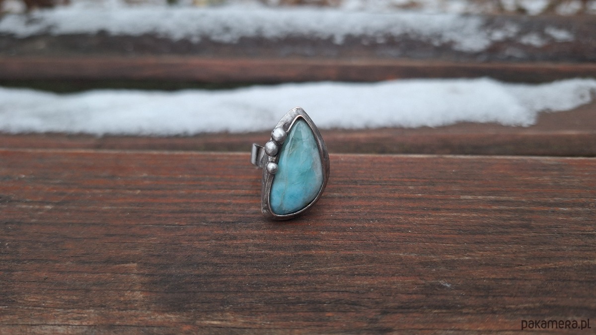 Pierścionek wykonany z miedzi, cyny i larimaru. Wymiary ok. 2.5 na 1.3 cm. Regulowany. Nie jest ciężki.