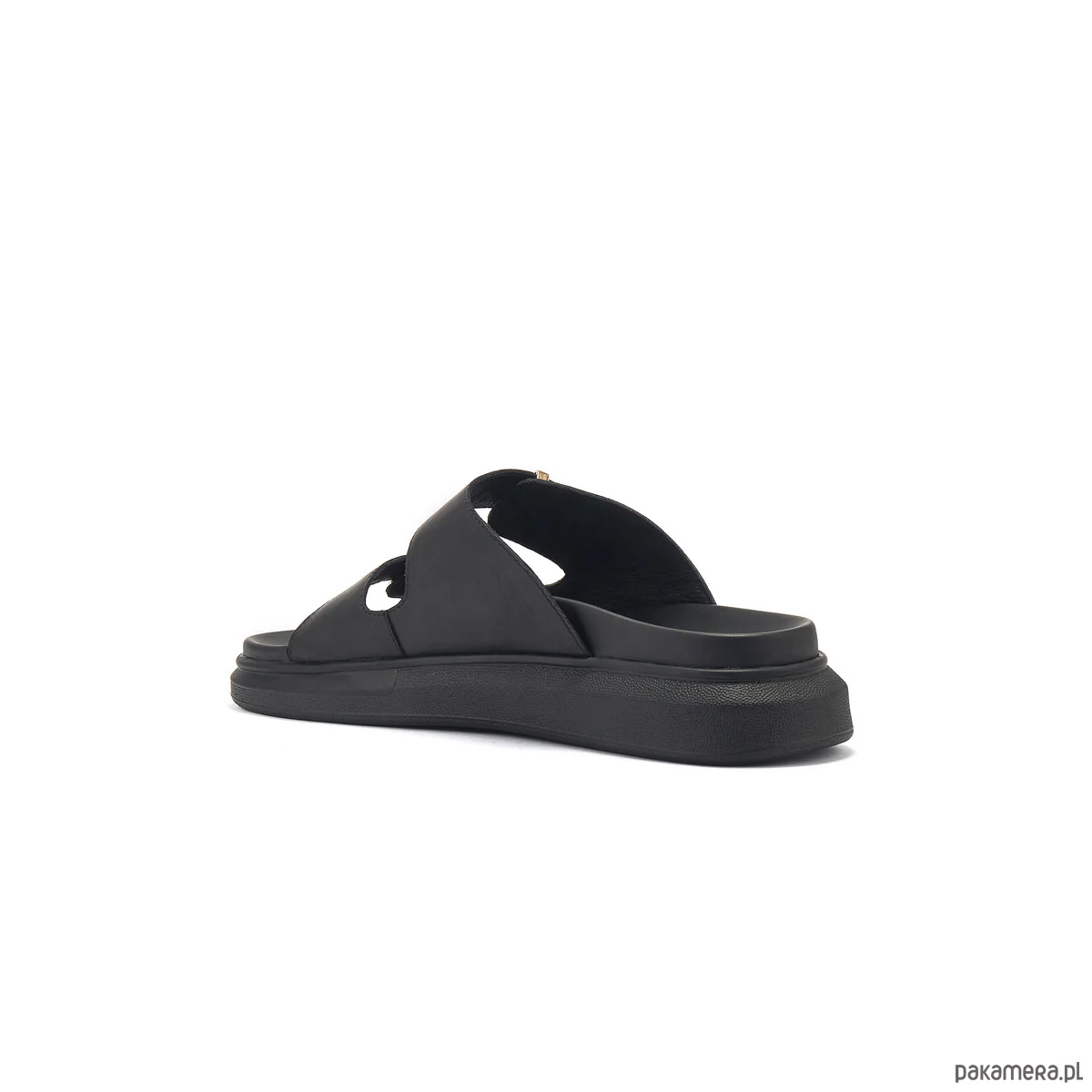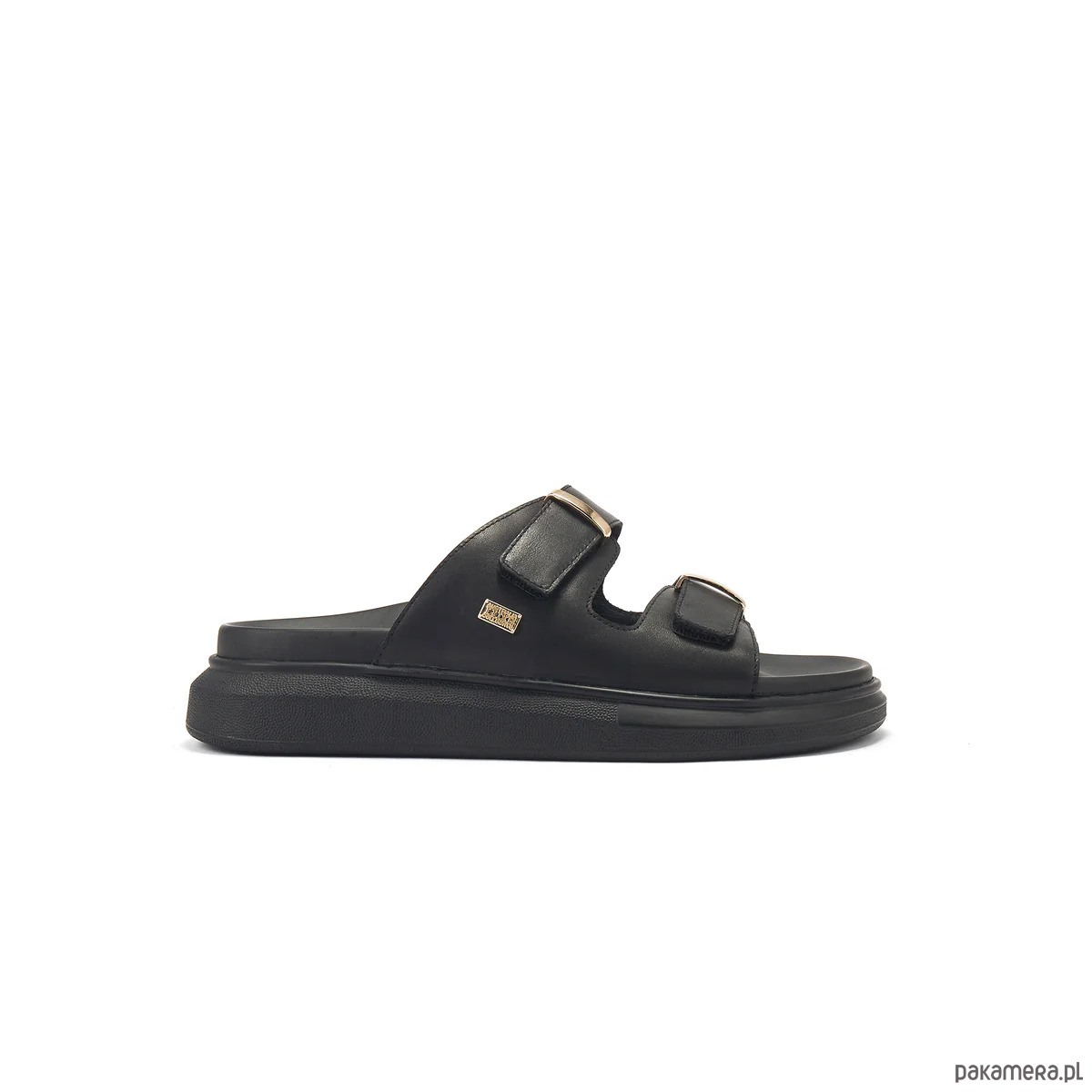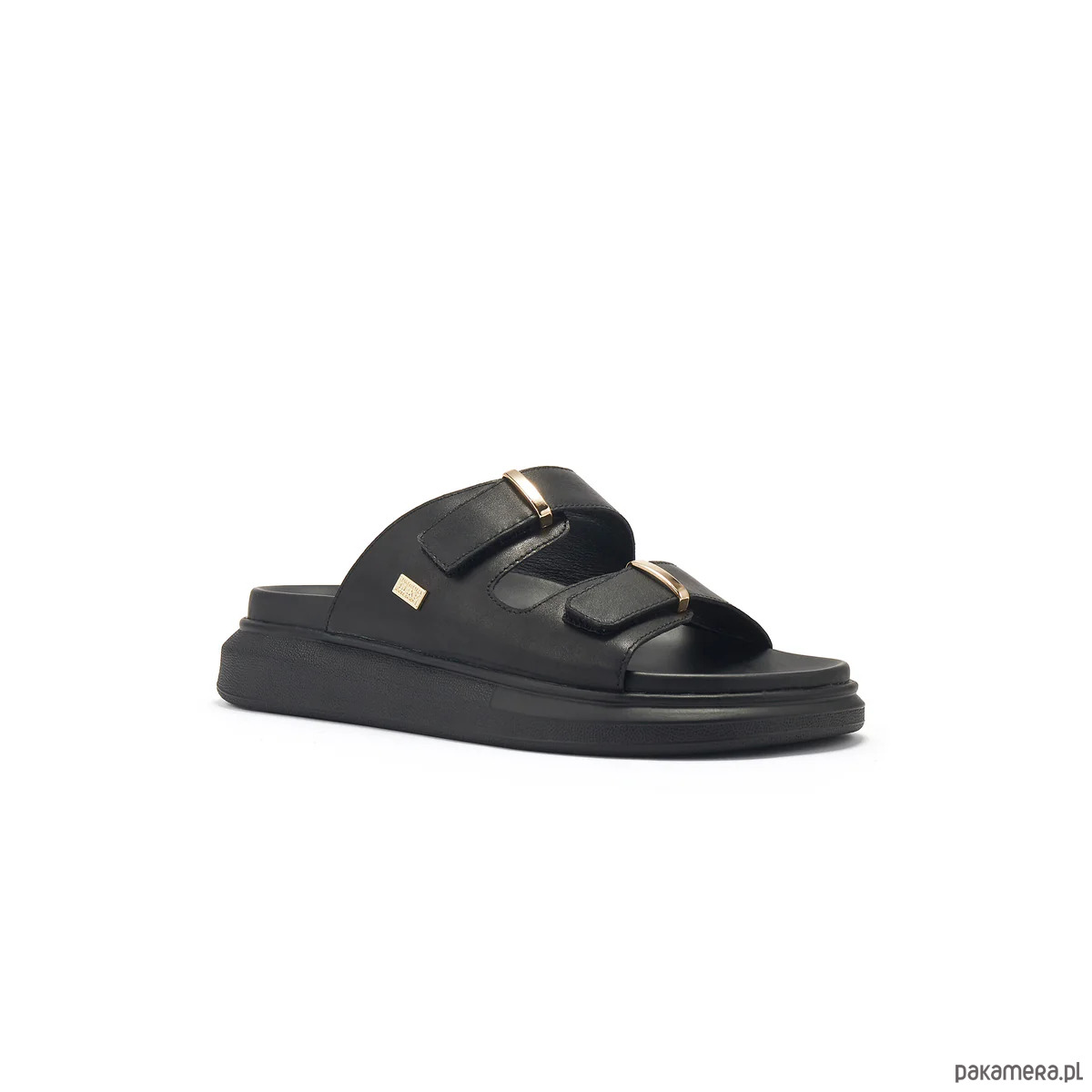 Letnie sandały z miękkiej skóry nappa, z dwoma regulowanymi paskami na rzepy i delikatną złotą sprzączką. Wyściełana wkładka ze skóry nappa i sprężysta, wygodna gumowa podeszwa.