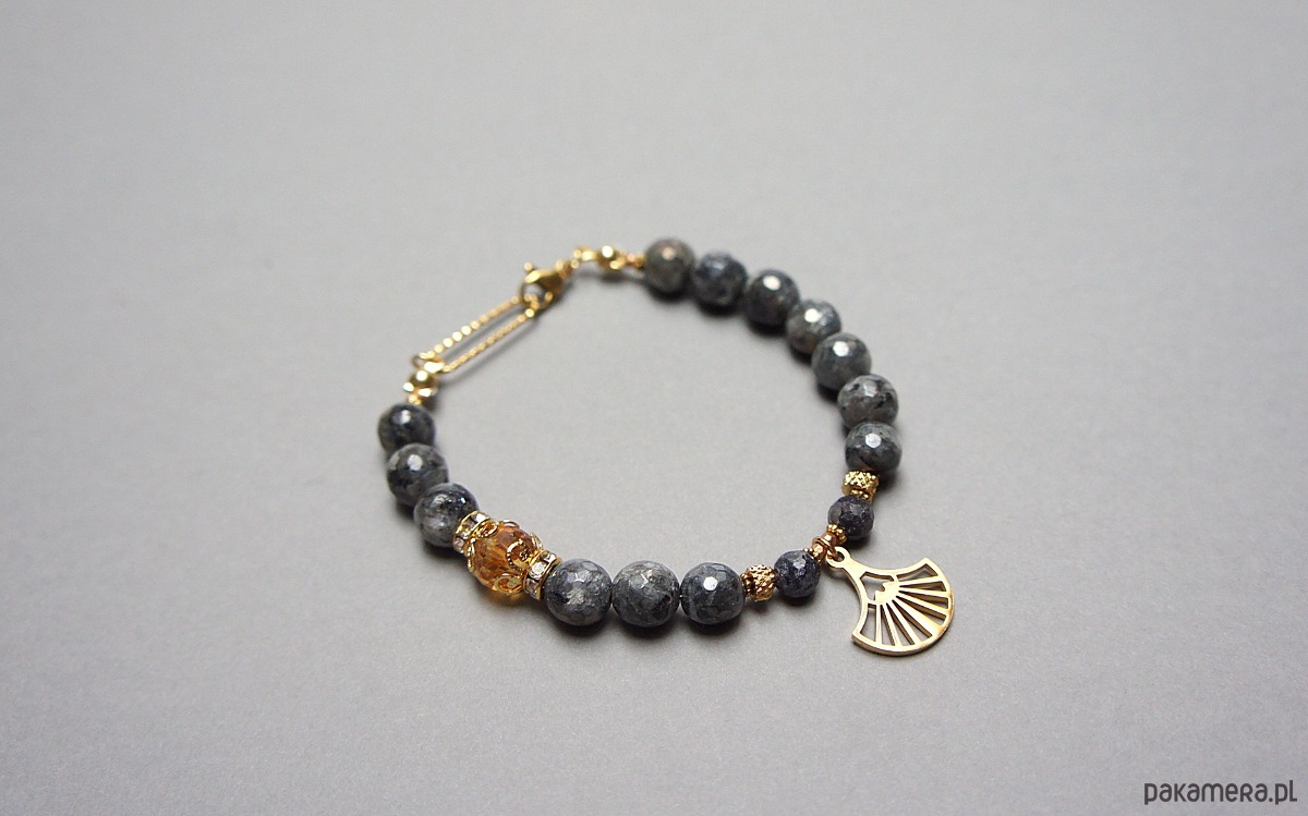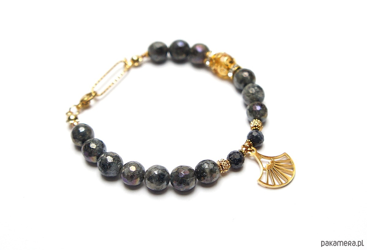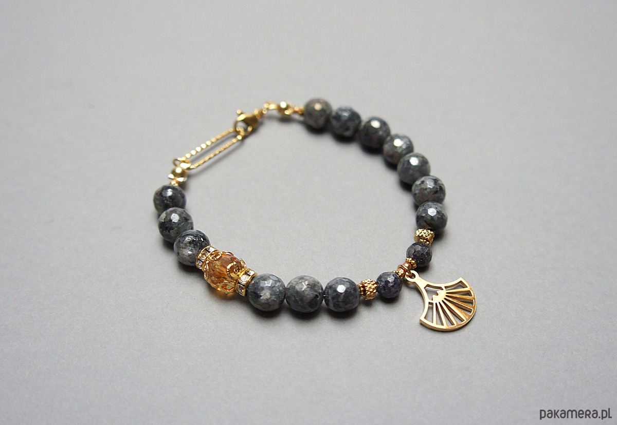 Delikatna bransoletka wykonana w całości ze stali szlachetnej pozłacanej, szlachetnych kamieni - larvikit fasetowany z opalizującą powłoką mystic [8mm], szafirów fasetowanych [5mm], cytrynu fasetowanego [8mm]. Całkowita długość bransoletki ok. 19cm. Biżuteria ozdobnie zapakowana.