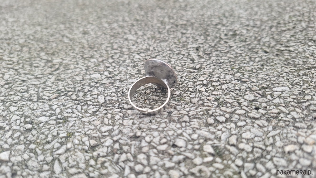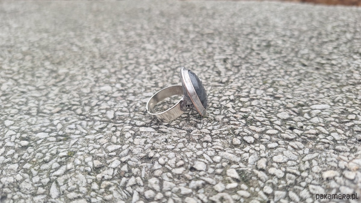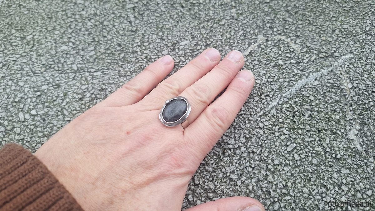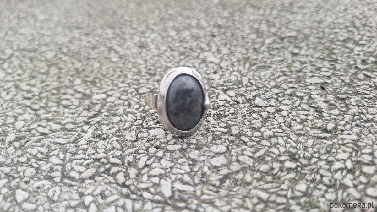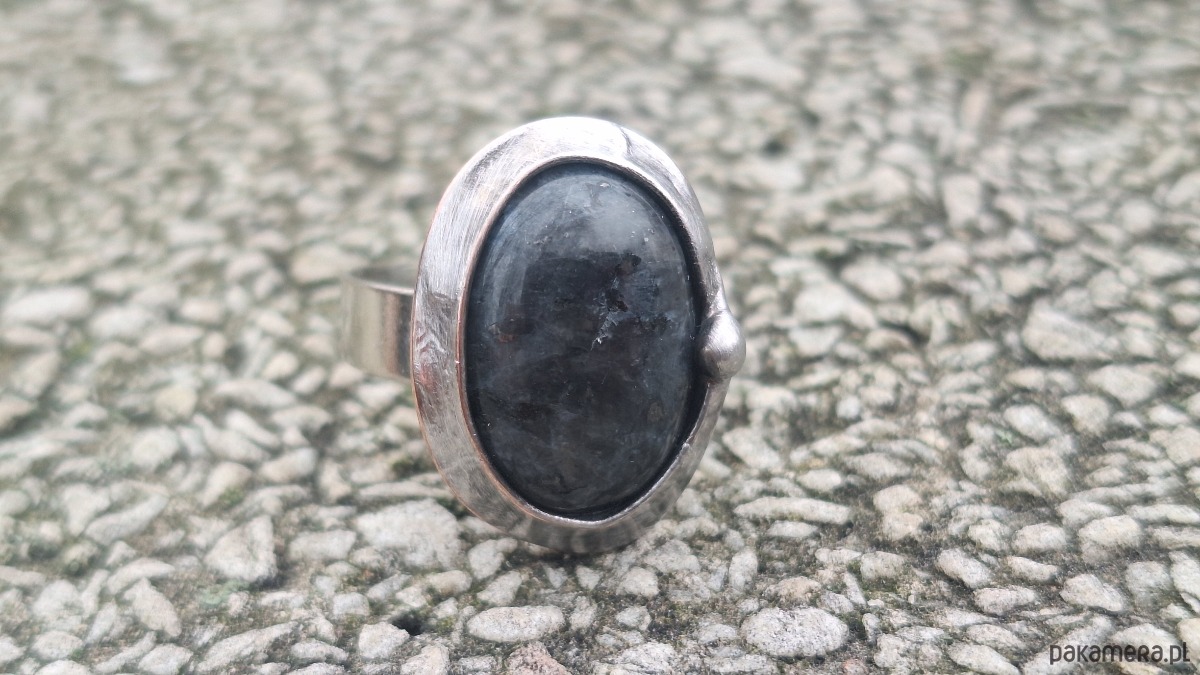Pierścionek wykonany z miedzi, cyny i larvikitu. Wymiary ok. 2 na 1.5 cm. Regulowany. Nie jest ciężki.