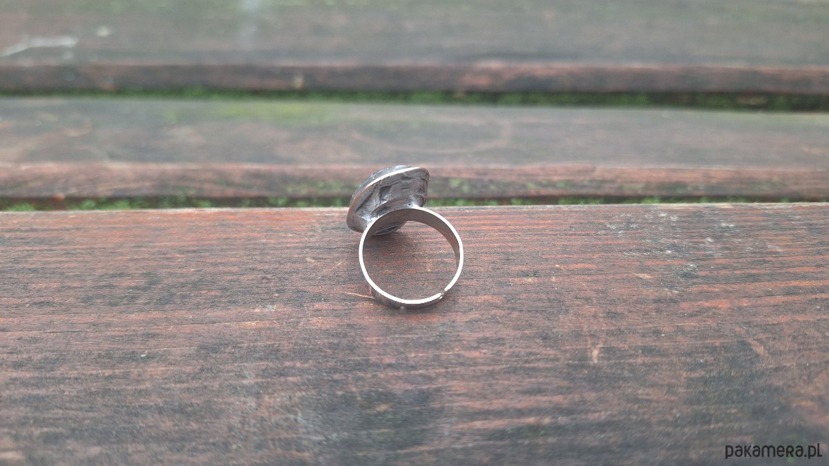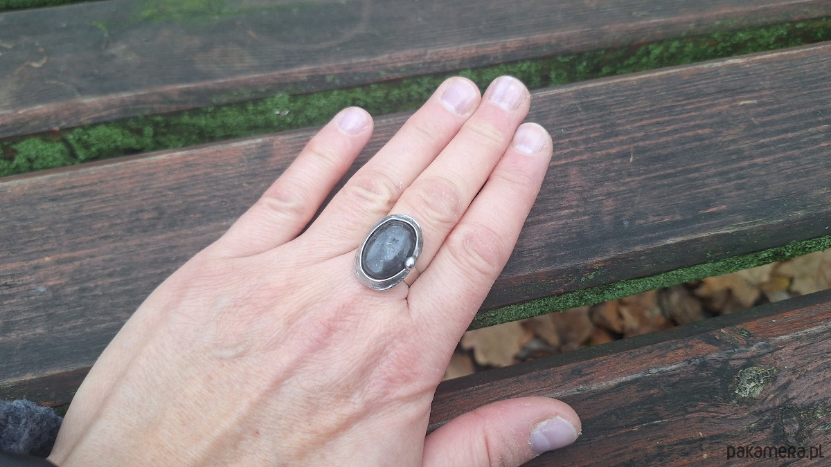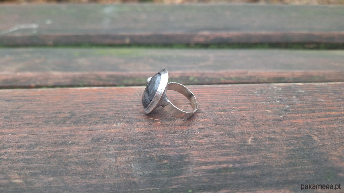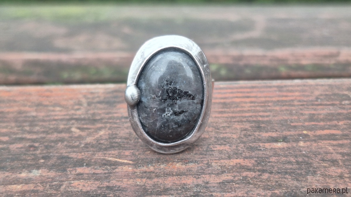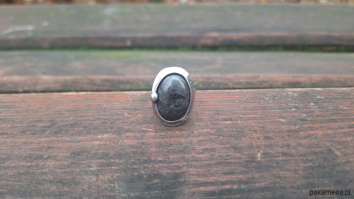 Pierścionek wykonany z miedzi, cyny i larvikitu. Wymiary ok. 2.2 na 1.5 cm. Regulowany. Nie jest ciężki.