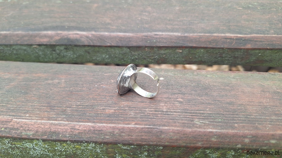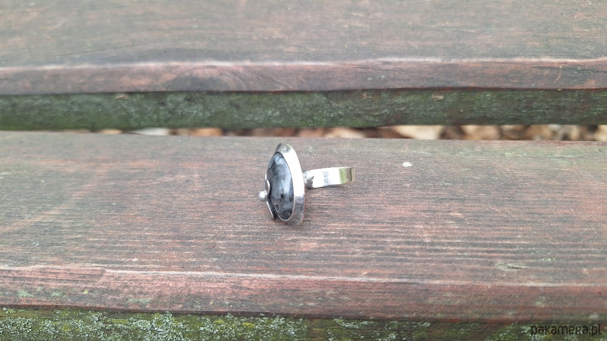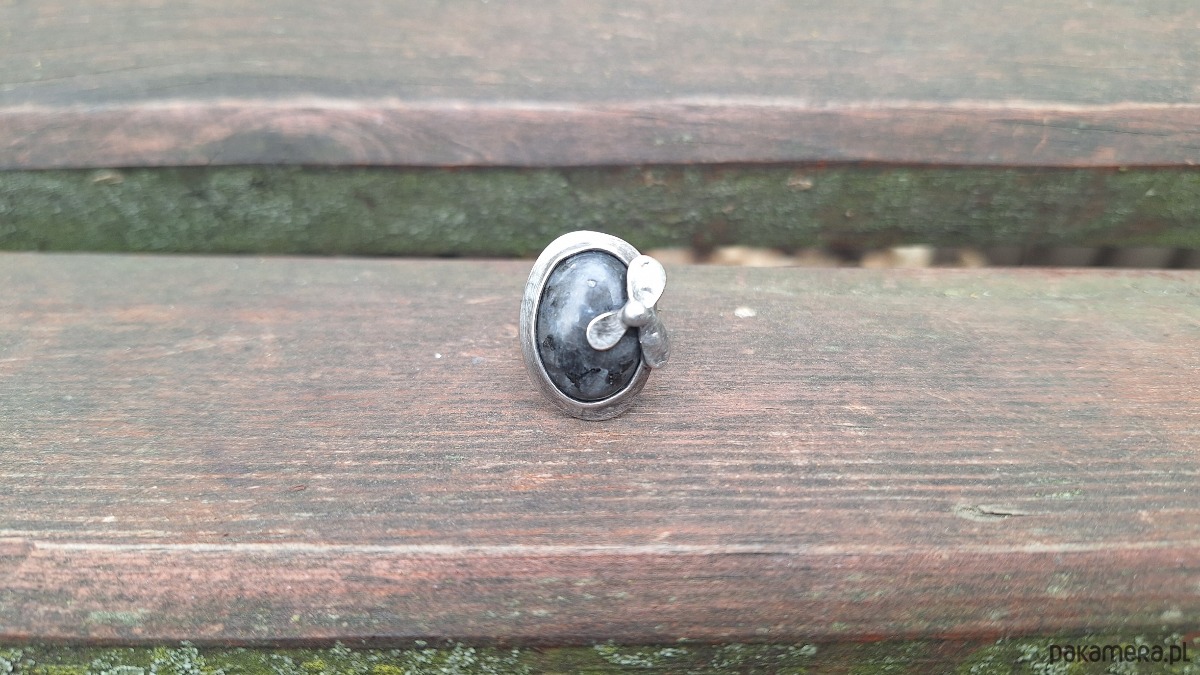 Pierścionek wykonany z miedzi, cyny i larvikitu. Wymiary ok. 2.2 na 1.5 cm. Regulowany. Nie jest ciężki.