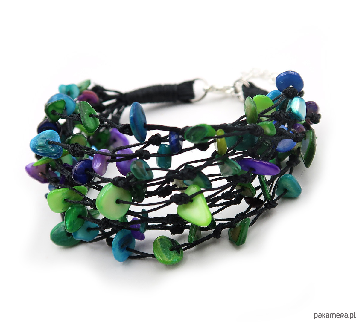 Tajemnicza, ręcznie wypleciona bransoleta wykonana na bazie czarnej przędzy lnianej z dodatkiem masy perłowej w odcieniach zieleni, błękitów i fioletów.
