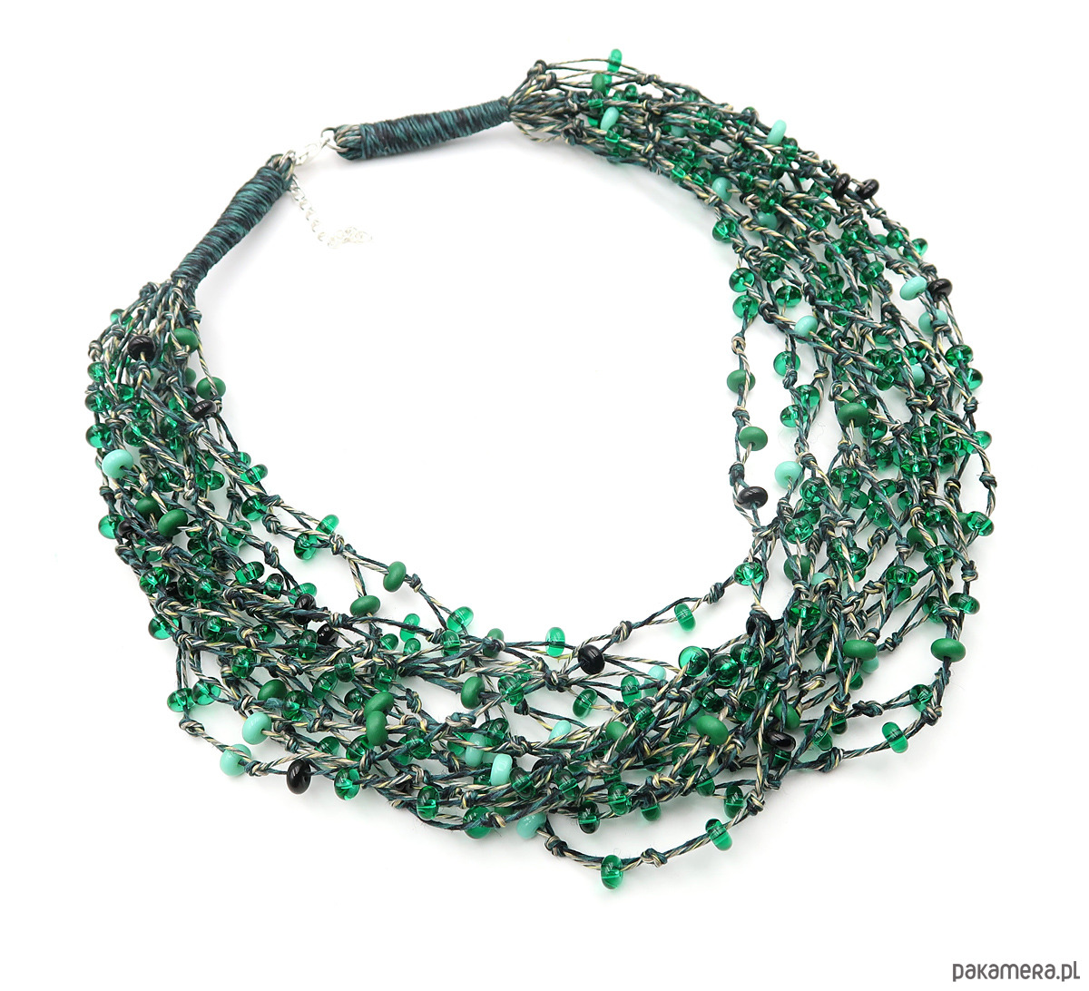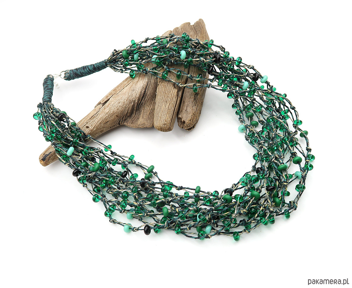 Naszyjnik stworzony z myślą o kobietach ceniących naturę. Wykonany na polskiej przędzy lnianej w odcieniach zieleni, czerni i naturalnego lnu, z wplecionymi elementami szklanego czeskiego szkła Jablonex, które dodają mu subtelnego blasku i organicznego charakteru.