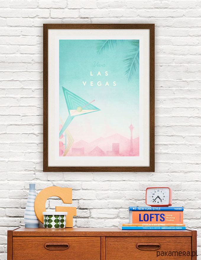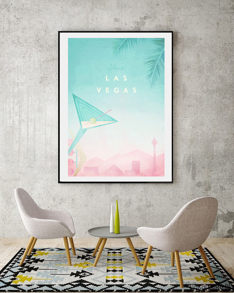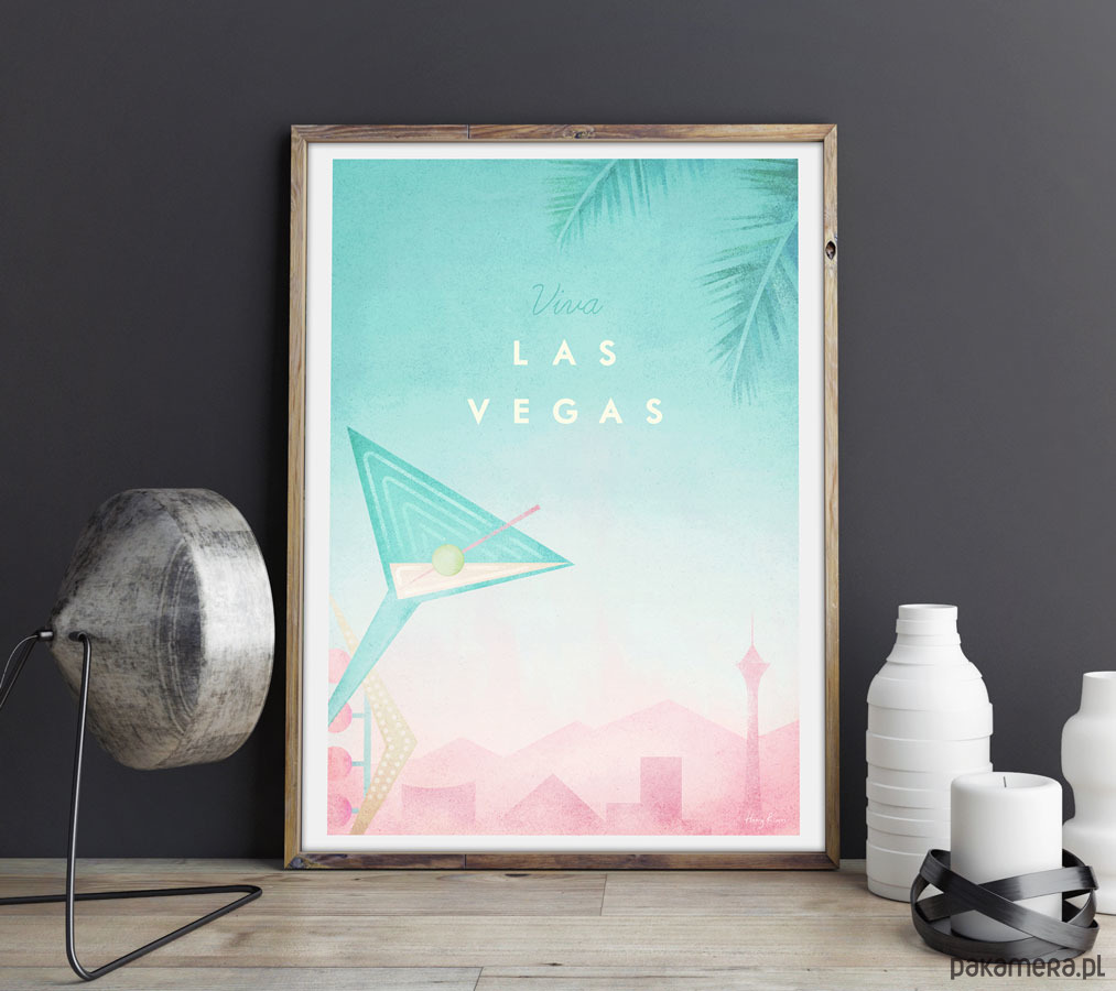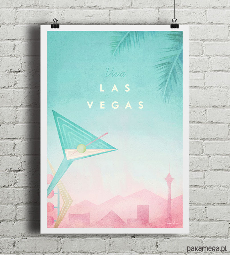Autorski plakat w stylu vintage przedstawiający widok z Fremont Street na śródmieście Las Vegas, z retro neonami, palmami wzdłuż chodników i wyjątkową panoramą The Strip. W oddali zachód słońca oświetla niebo różowymi odcieniami. Inspirowany plakatami podróżniczymi z lat 20-tych XX wieku. Inspirowany plakatami podróżniczymi z lat 20-tych XX wieku.