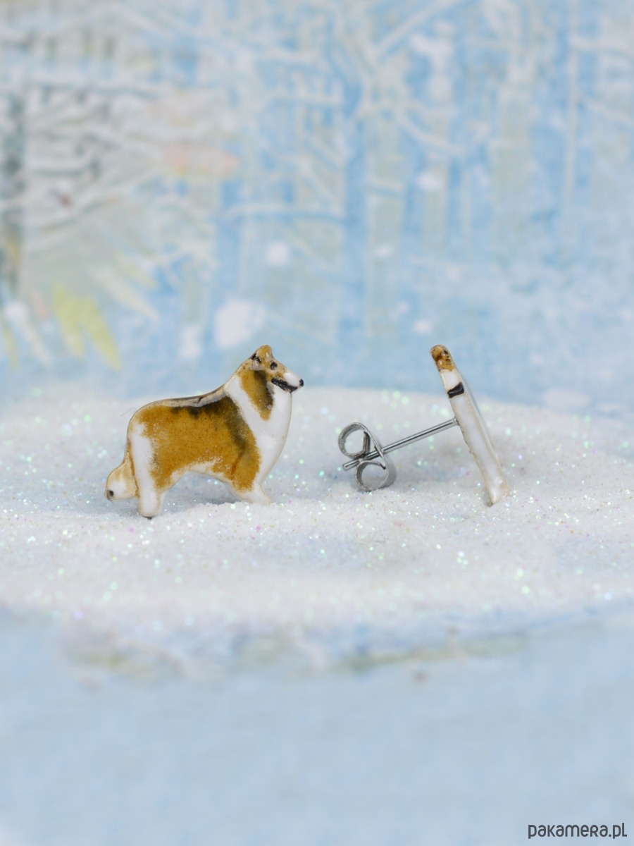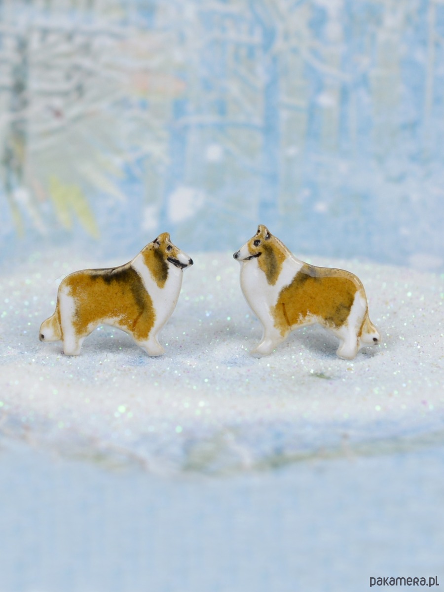 Malutkie pieski poszkliwione w kolorze miodowym z akcentami bieli mają wymiary: 1,5cm wysokość( z głową), 1,7cm szerokość( z ogonkiem), 1,5mm grubość. Kolczyki wykonuję od podstaw ręcznie:) Każda para jest inna:))) Lassie zostały solidnie umocowane na sztyftach ze stali chirurgicznej- antyalergiczna w kolorze oksydowanego srebra. Wysyłam w ozdobnym pudełeczku.