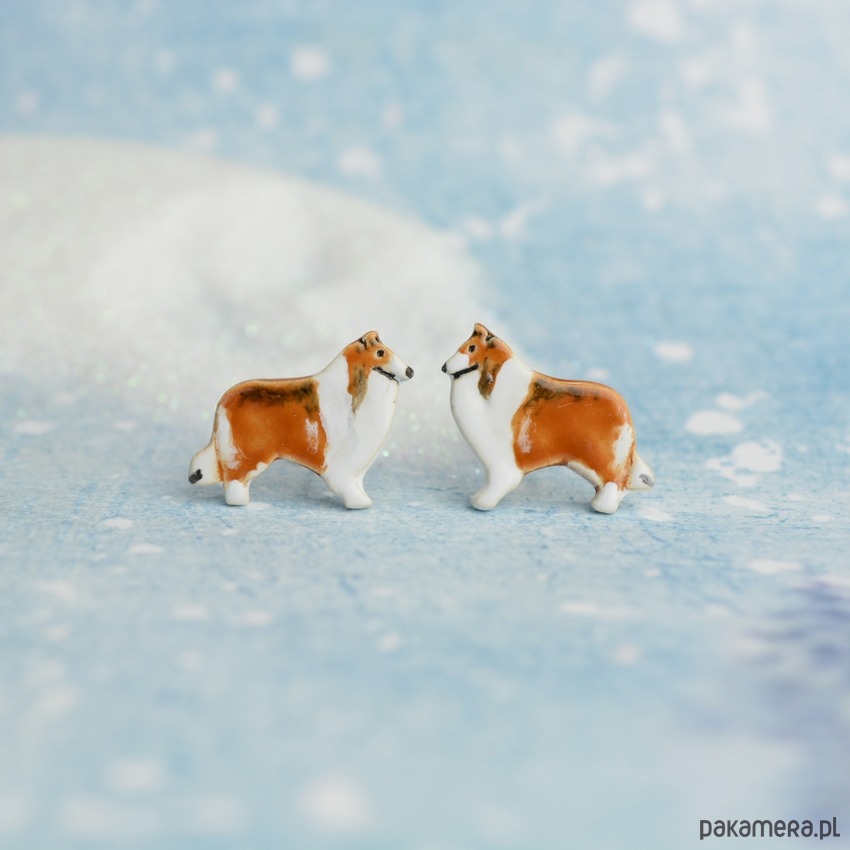 Malutkie pieski poszkliwione w kolorze rudym z akcentami bieli mają wymiary: 1,5cm wysokość( z głową), 1,7cm szerokość( z ogonkiem), 1,5mm grubość. Kolczyki wykonuję od podstaw ręcznie:) Każda para jest inna:))) Lassie zostały solidnie umocowane na sztyftach ze stali chirurgicznej- antyalergiczna w kolorze oksydowanego srebra. Wysyłam w ozdobnym pudełeczku.