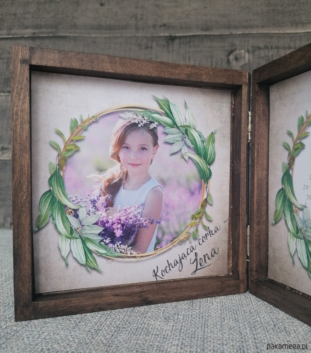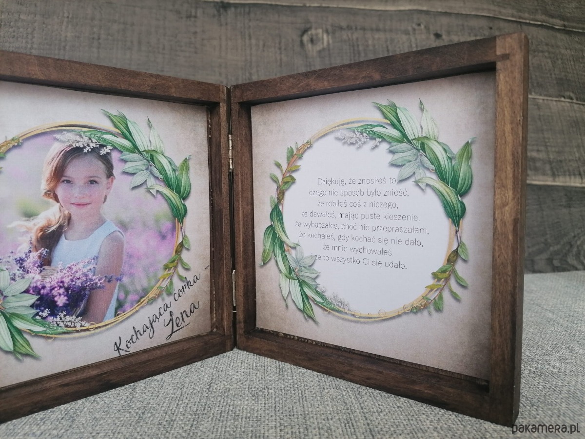 Ramka ta jest w formie drewnianej laurki, w której umieścimy przesłane przez was zdjęcie oraz życzenia z podpisem.