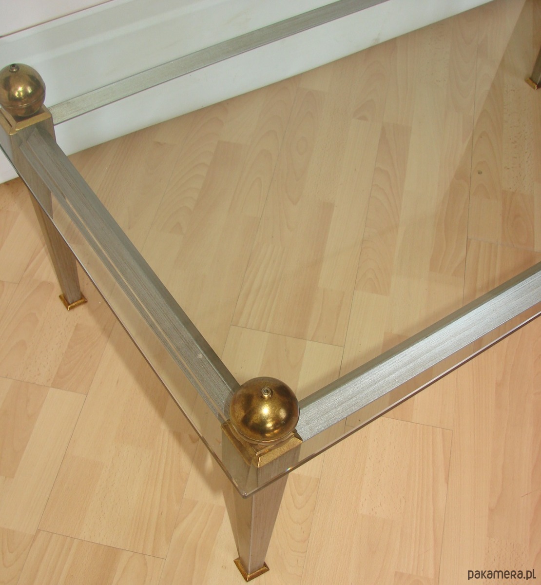 Stylowa ława Art Deco z lat 80. XX wieku. Konstrukcja z metalu i mosiądzu, blat z grubego szkła szlifowanego o grubości 10–12 mm. Mebel zachowany w bardzo dobrym stanie, stabilny i efektowny wizualnie. Idealna do salonu oraz wnętrz vintage, glamour i modern classic.