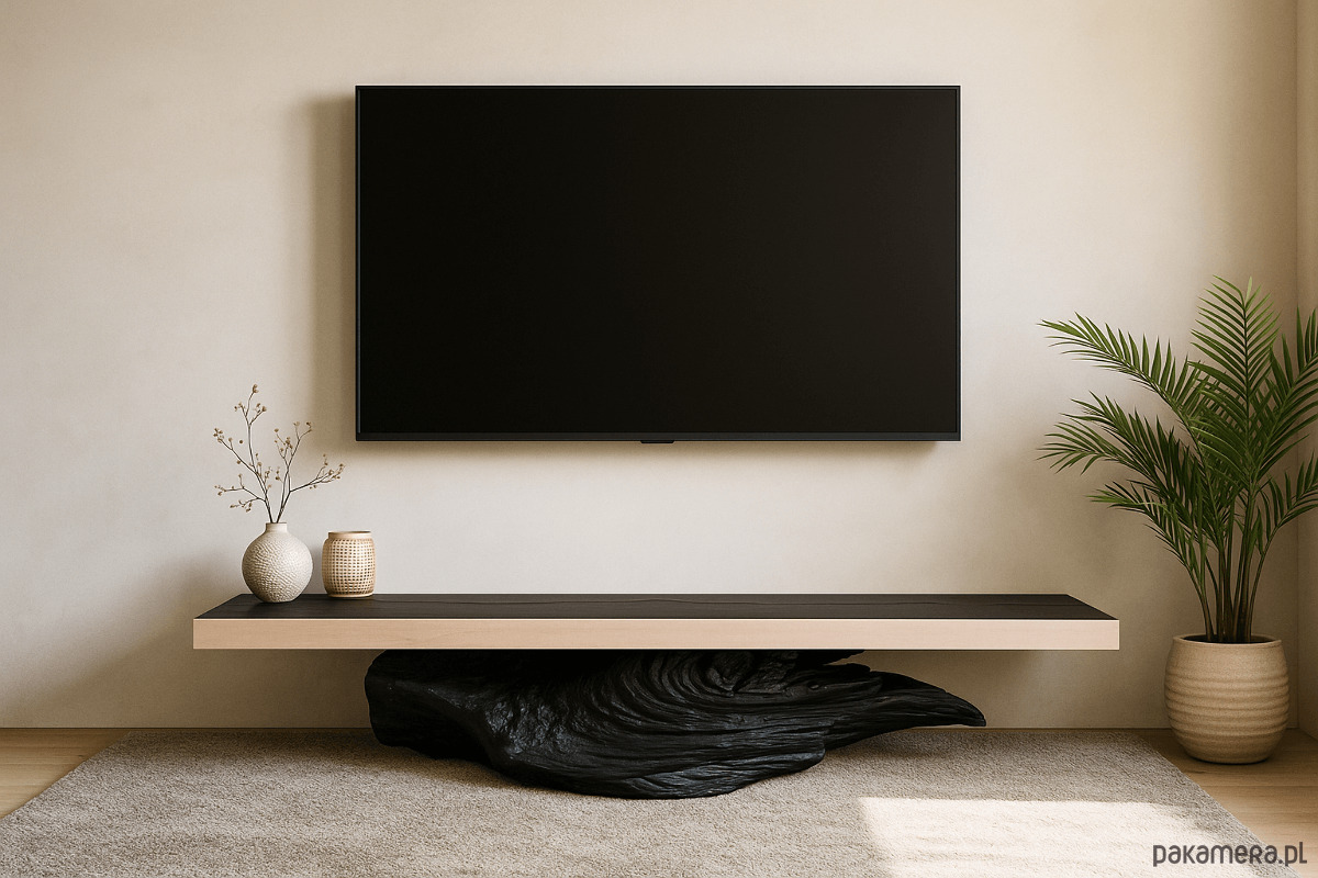 Niska drewniana ława, która może służyć jako stolik kawowy lub jako półka pod telewizor.