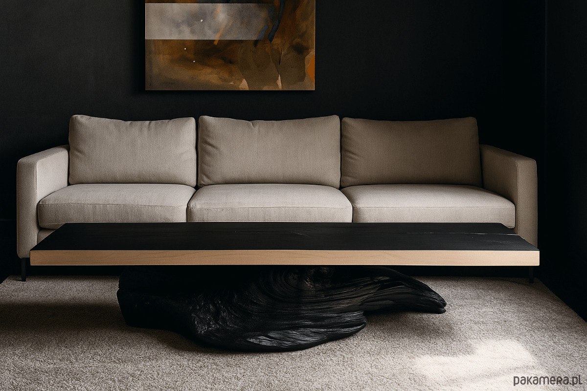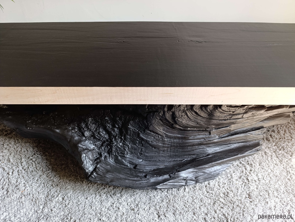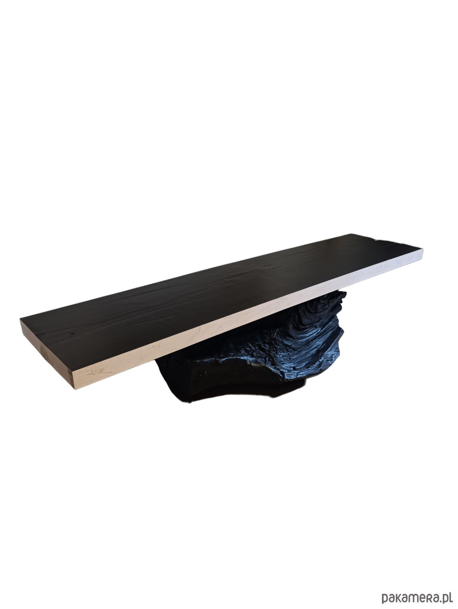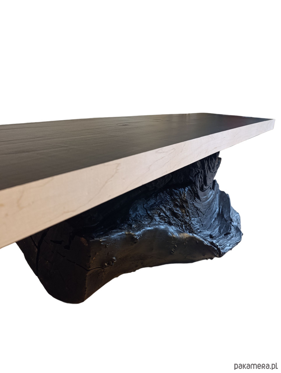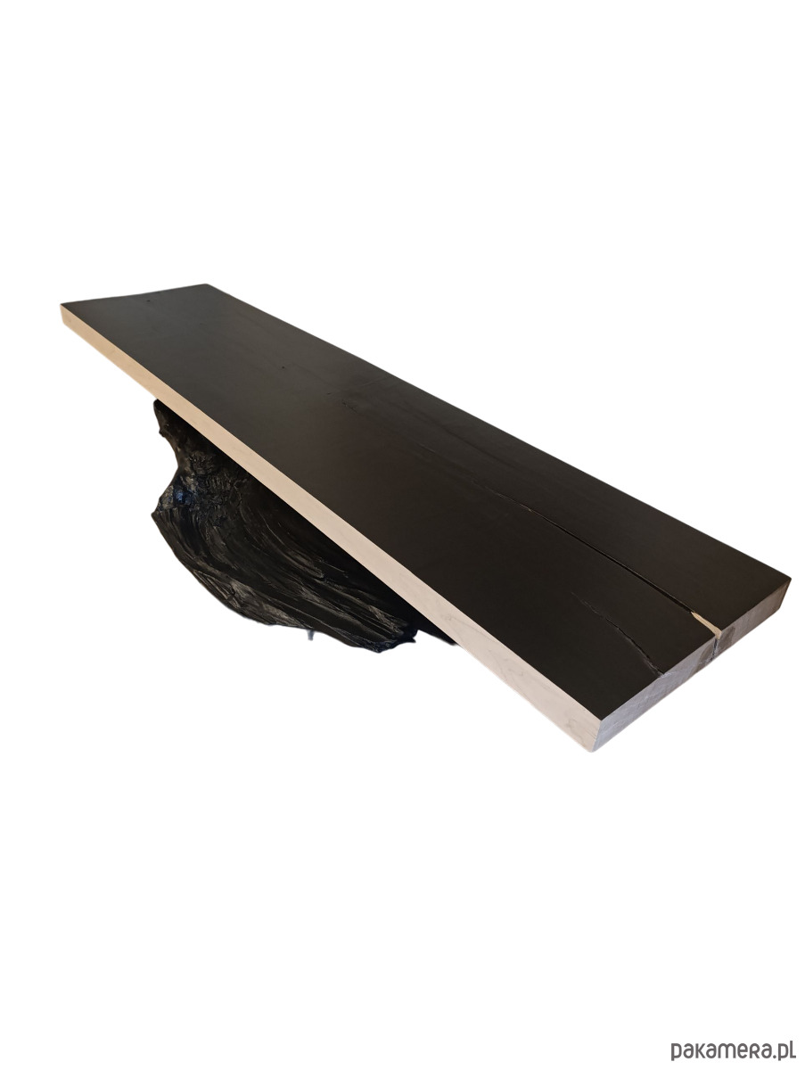 Wykonana ręcznie, z litego drewna. Blat spoczywa na nieregularnej podstawie z pnia drzewa, nadając meblowi wyjątkowy charakter. Naturalne cechy drewna, takie jak usłojenie, pęknięcia i nierówności powierzchni, są zachowane. Do wnętrz minimalistycznych, w stylu Japandi lub nowoczesnych.