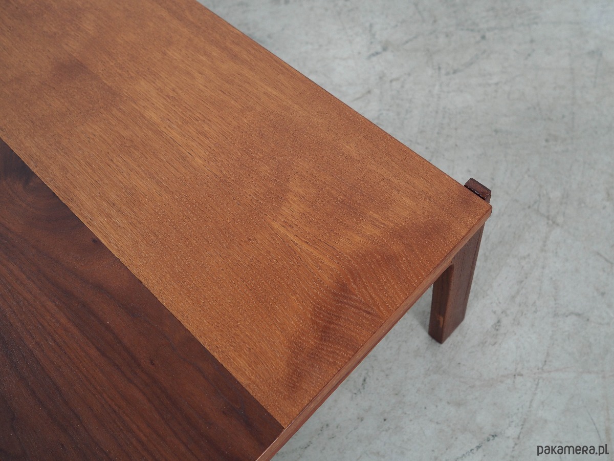 Blat ławy pokryty fornirem orzechowym oraz dębowym. Nogi zostały pokryte fornirem tekowym. Powierzchnia po odświeżeniu. Ponadczasowa konstrukcja mebla sprawia, że wkomponuje się on w każde wnętrze i będzie doskonale spełniał swoja rolę jako element wyposażenia salonu.