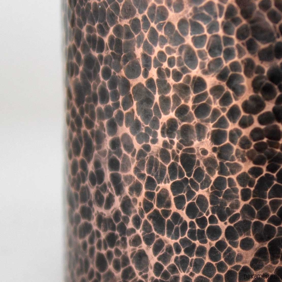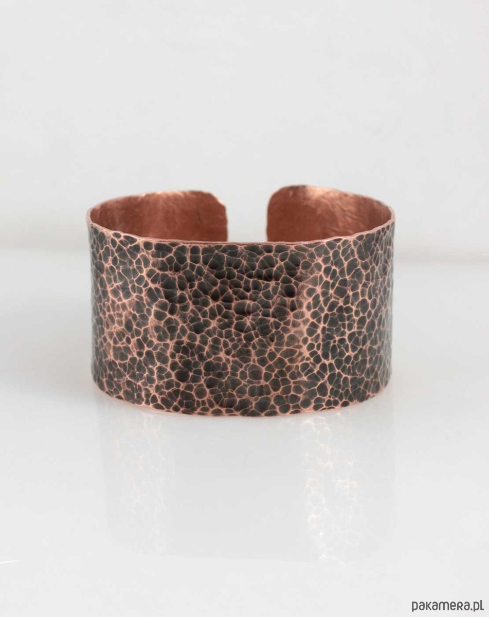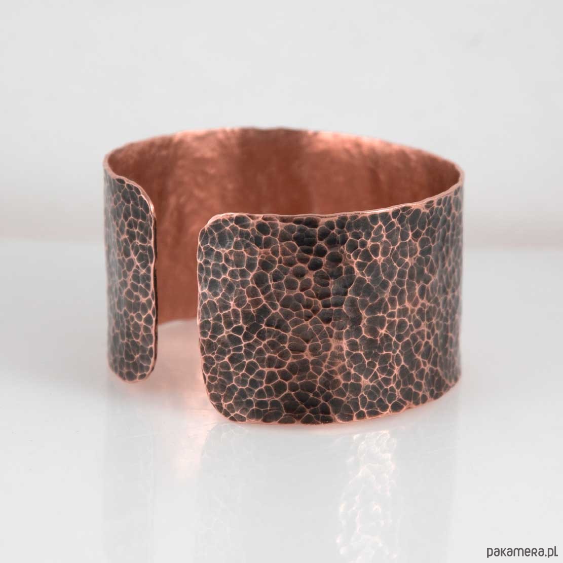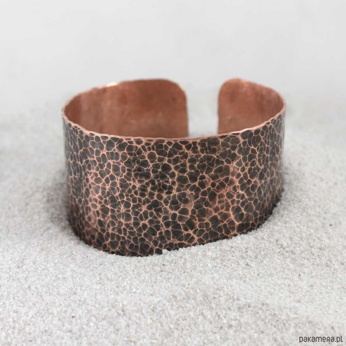 Bransoletka została wykonana w całości z miedzi, ma ok 3 cm szerokości. Wzór jest lekko podkreślony ciemną patyną uzyskaną w procesie oksydacji (bez użycia sztucznych barwników).