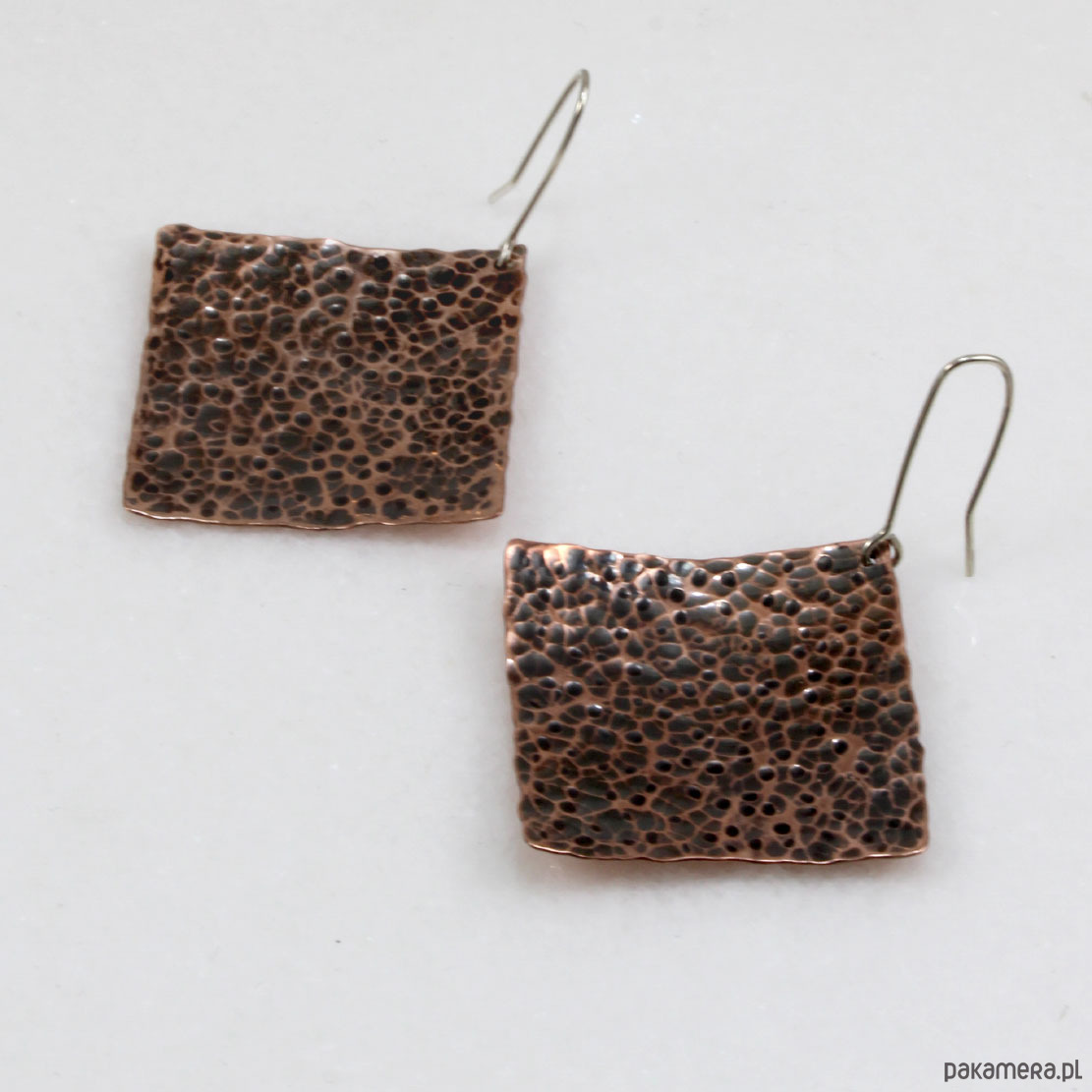 Kolczyki zostały wykonane ręcznie z miedzi. Mają ciekawą fakturę i są lekko patynowane w procesie oksydacji (bez użycia sztucznych barwników). Całkowita długość kolczyka to ok 6 cm. Bigle ręcznie wykonane ze srebra. Na zamówienie mogę je wymienić na eleganckie srebrne klipsy (proszę o wiadomość).