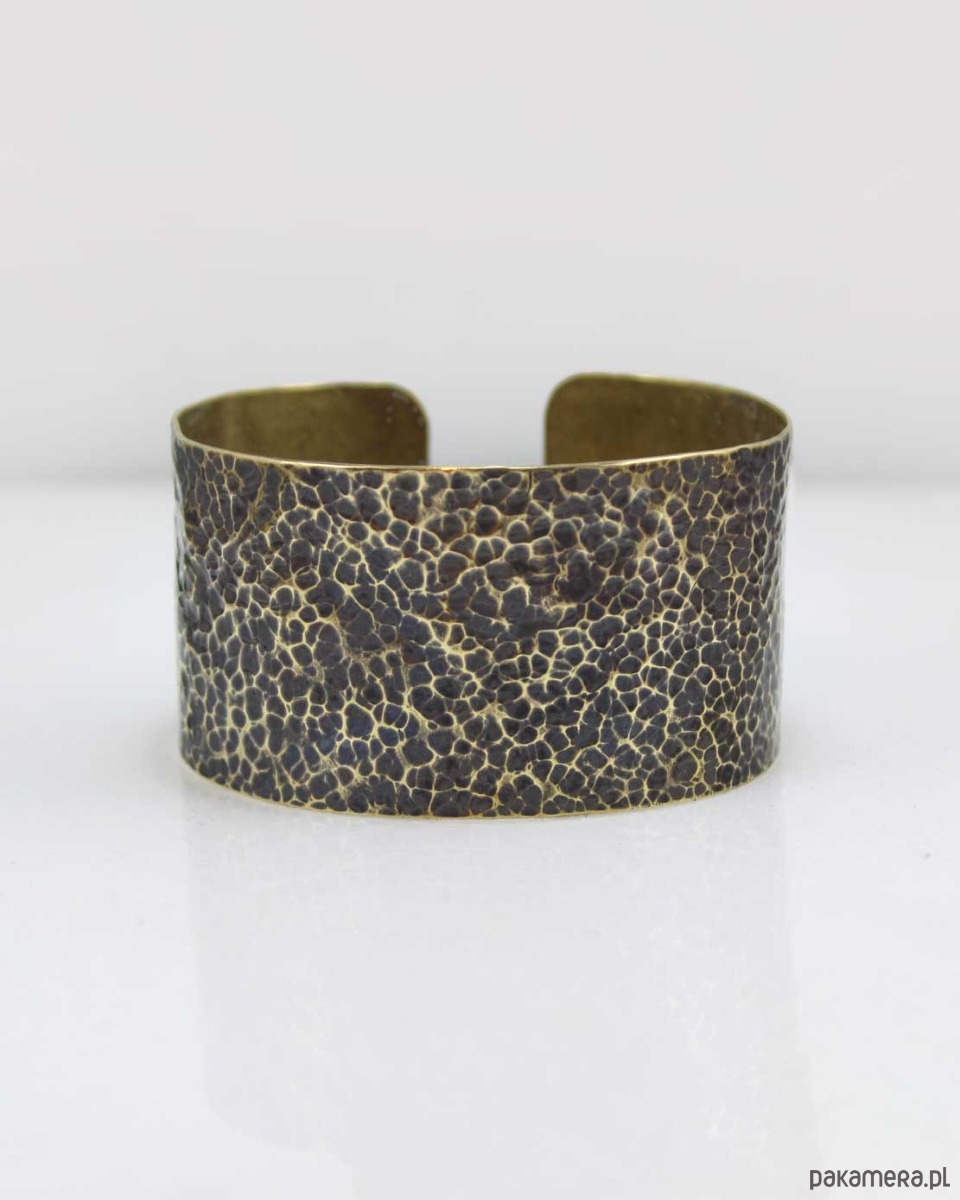 Bransoletka została wykonana w całości z mosiądzu, ma ok 3 cm szerokości. Wzór jest lekko podkreślony ciemną patyną uzyskaną w procesie oksydacji (bez użycia sztucznych barwników).