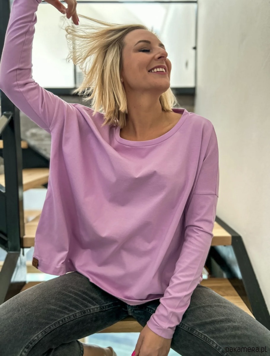Bawełniana, obszerna bluzka w wiosennym jasnym odcieniu lawendowym. Dopasowane rękawy, dekolt okrągły. Niesamowity komfort noszenia. Niegruby materiał.