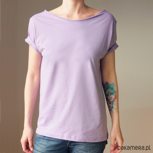Liliowy casualowy tshirt z ciętym dekoltem. Idealny na ciepłe dni.
