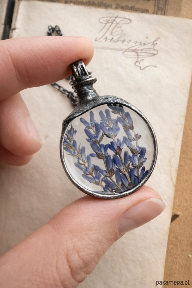W środku znajdują się gałązki lawendy oraz delikatne leśne roślinki, ułożone w subtelnej, naturalnej harmonii.
