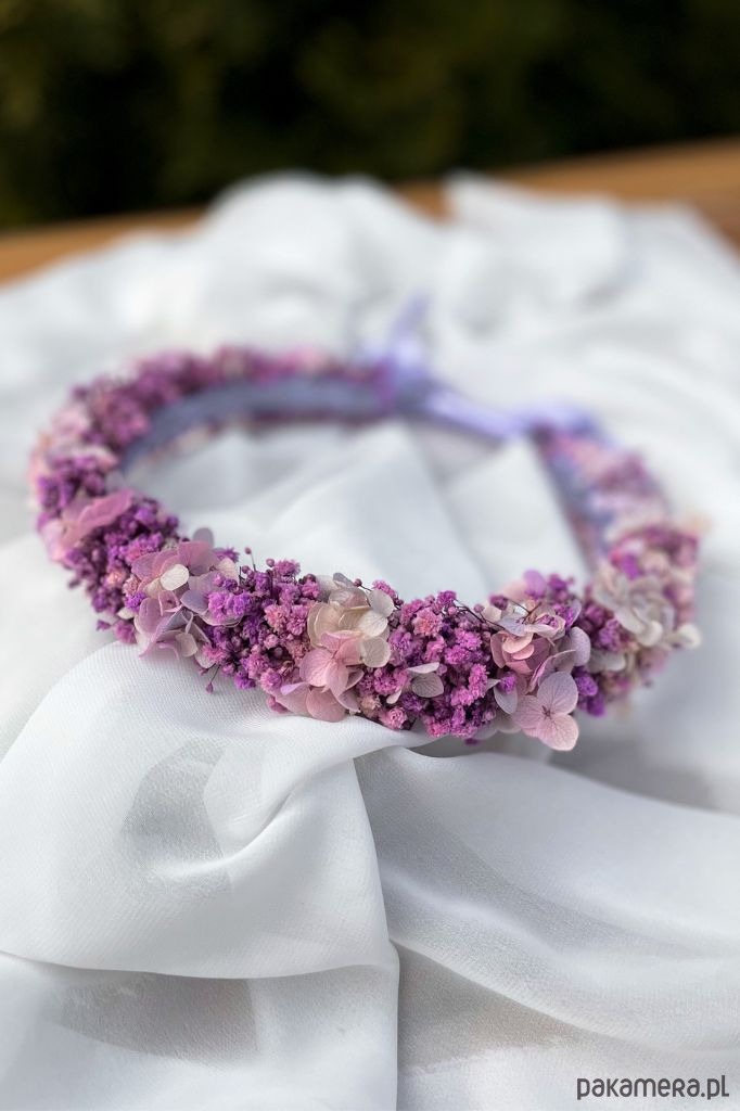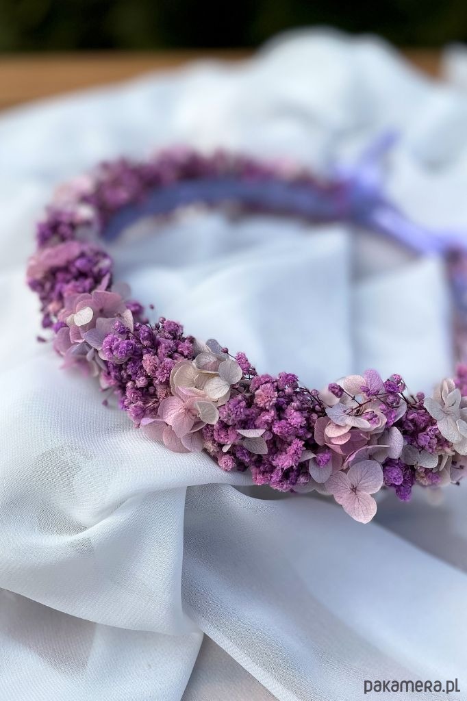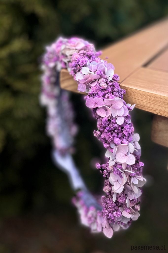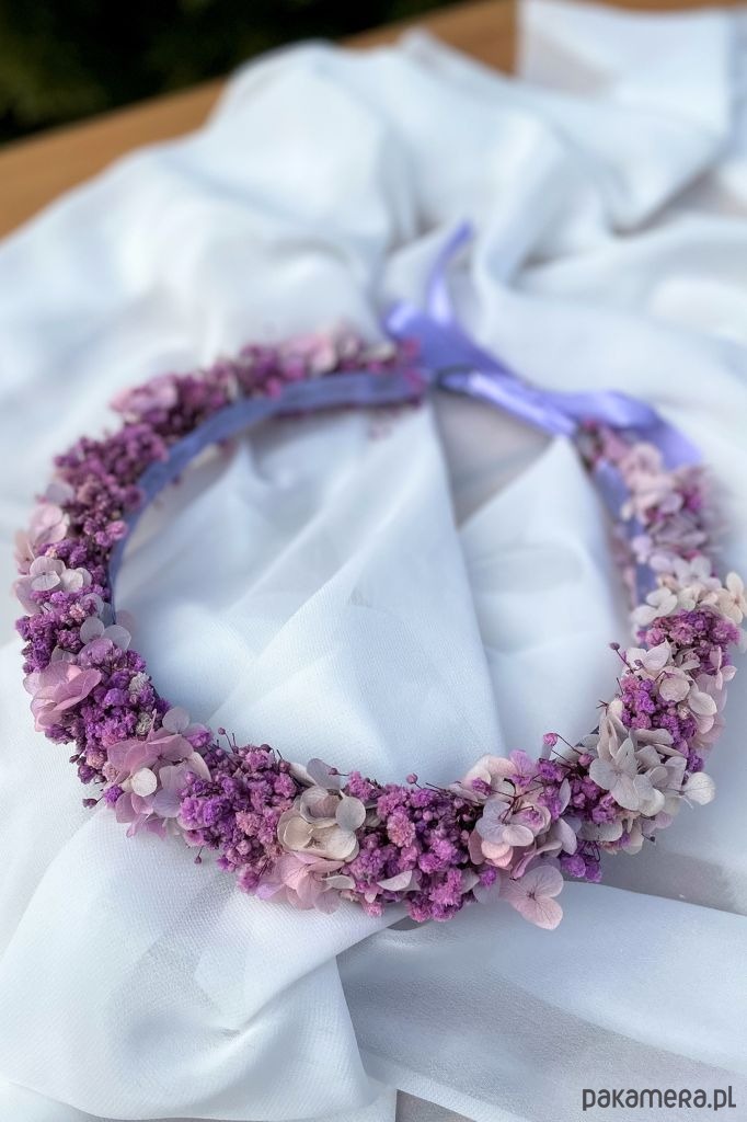 Lawendowy wianek na głowę to wyjątkowa ślubna ozdoba do włosów, która doda uroku i elegancji każdej Pannie Młodej. Wykonany z najwyższej jakości stabilizowanej hortensji w różnych odcieniach fioletu oraz stabilizowanej fioletowej gipsówki, wianek ten jest prawdziwą perełką wśród ślubnych ozdób do włosów.