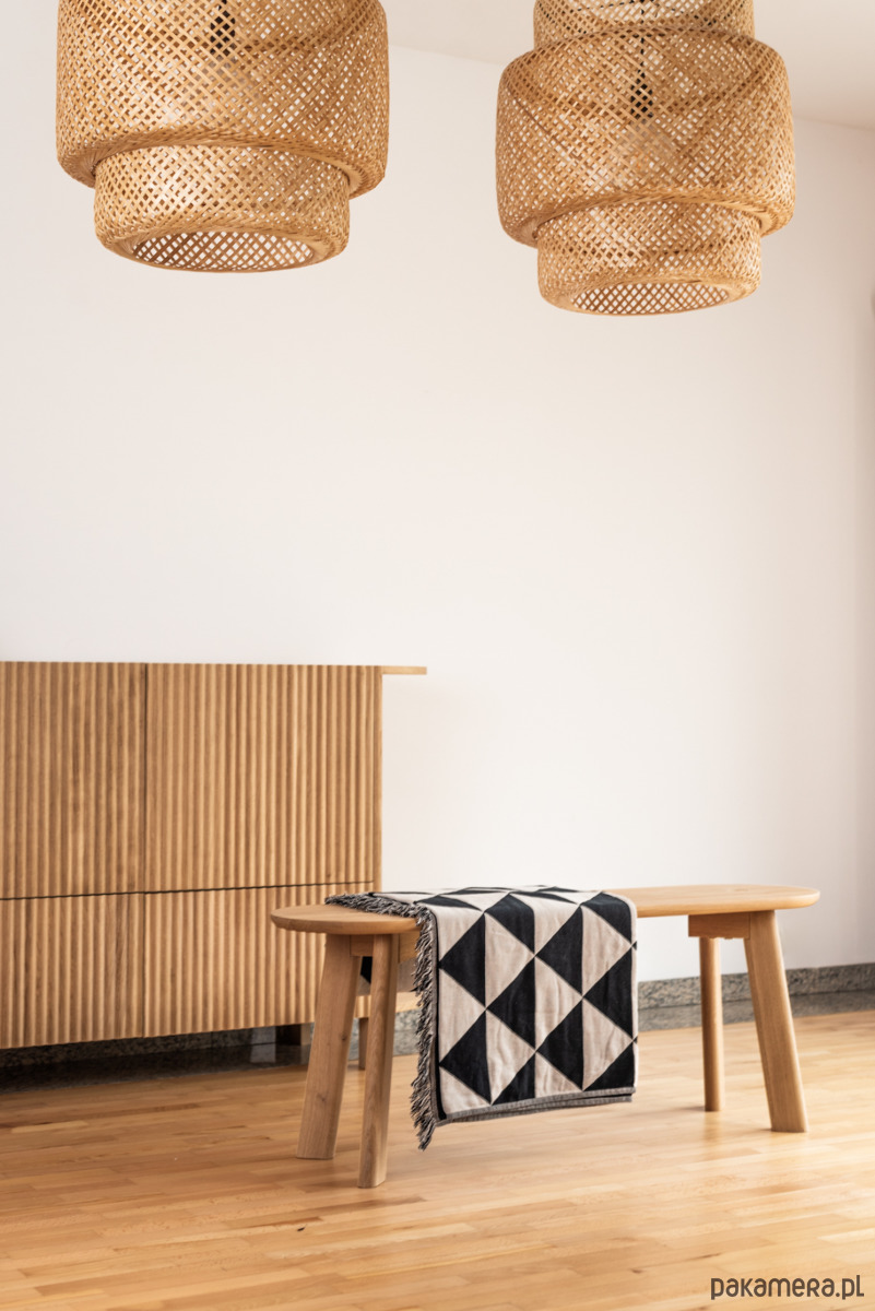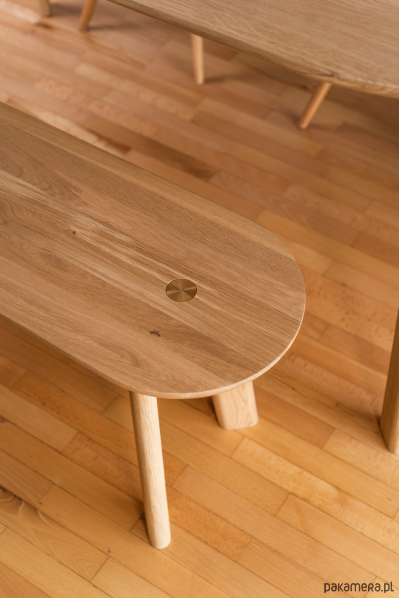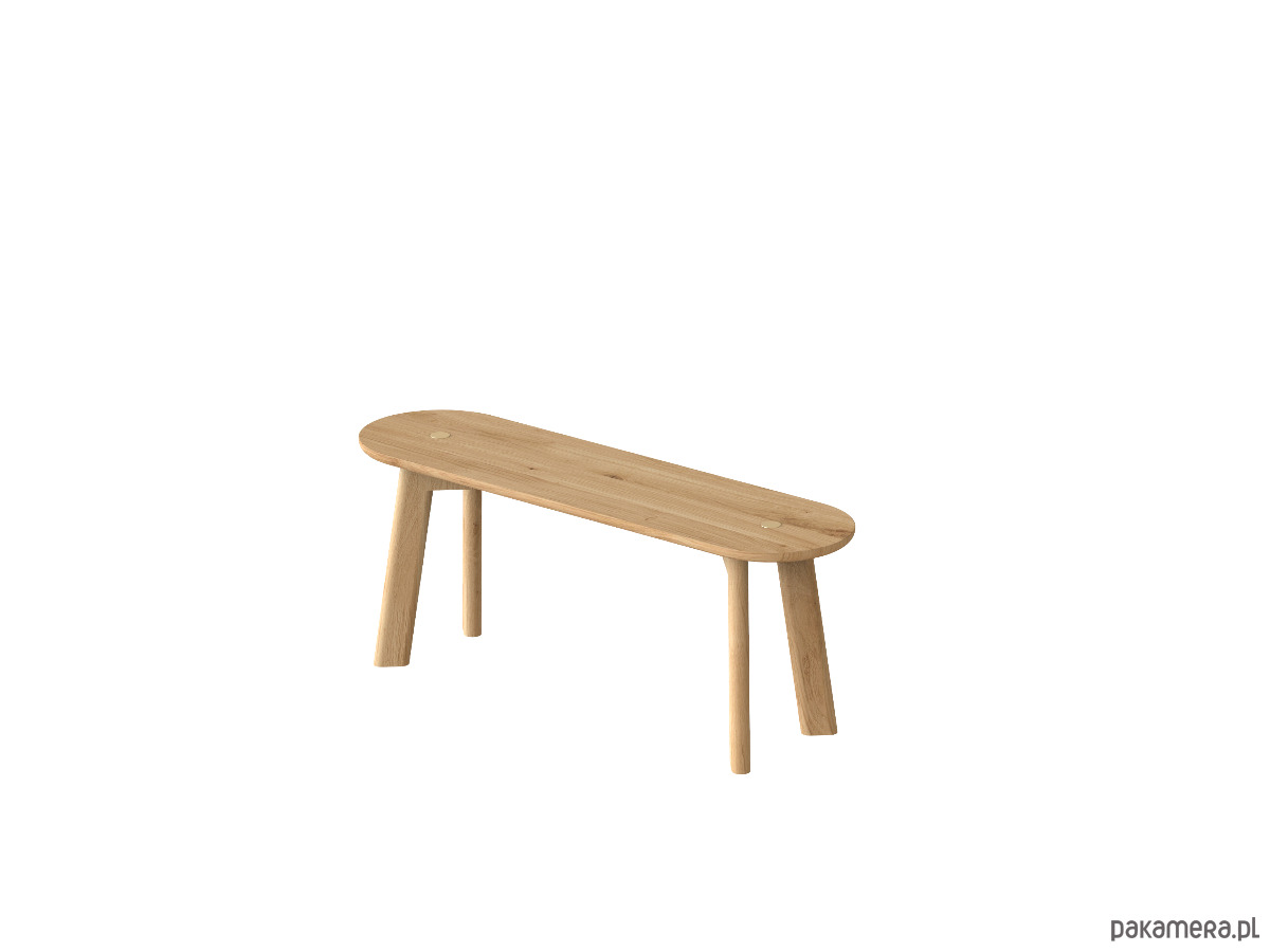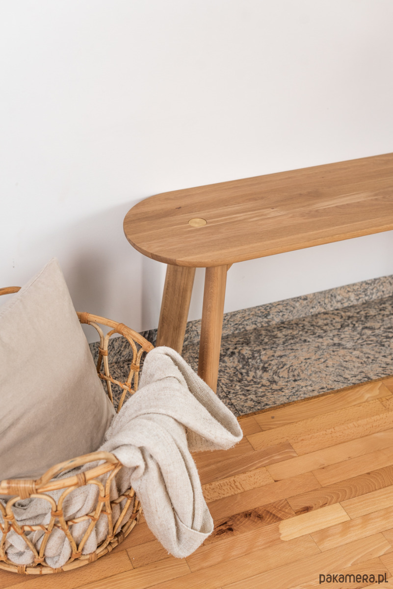 Ława do przedpokoju, salonu lub sypialni. Wykonana została z litego dębu i pomalowany matowym lakierem, które nadaje dębowi surowego wyglądu. W przedpokoju idealnie sprawdzi się do ubierania butów, w salonie przy stole, a w sypialni obok łóżka. Ma oryginalny design i wygląda lekko dzięki okrągłemu kształtowi. Dodatkowo posiada otwory zabezpieczone metalowymi zaślepkami w które zamontować możemy tackę, która świetnie sprawdzi się jako podstawka pod laptopa. Taca sprzedawana oddzielnie. Oferujemy bezpłatną wysyłkę zmontowanych mebli. Projekt nagrodzony w konkursie Dobry Wzór 2021.