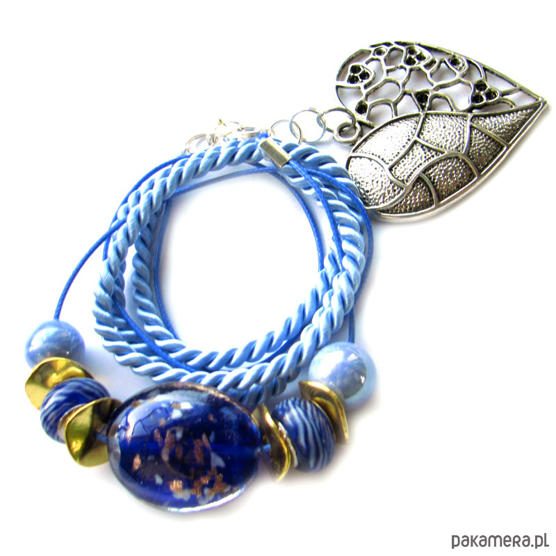 Bransoletka wykonana z 2 sznurków bardzo dobrej jakości woskowanego oraz skręcanego, korali lampwork, ceramicznych, złotych młotkowanych przekładek, korali typu pandora oraz dowieszki serca. Do 3-krotnego owinięcia wokół nadgarstka. Długość 51 cm, pasuje na nadgarstek 15-16,5 cm. Zapięcie typu karabińczyk.