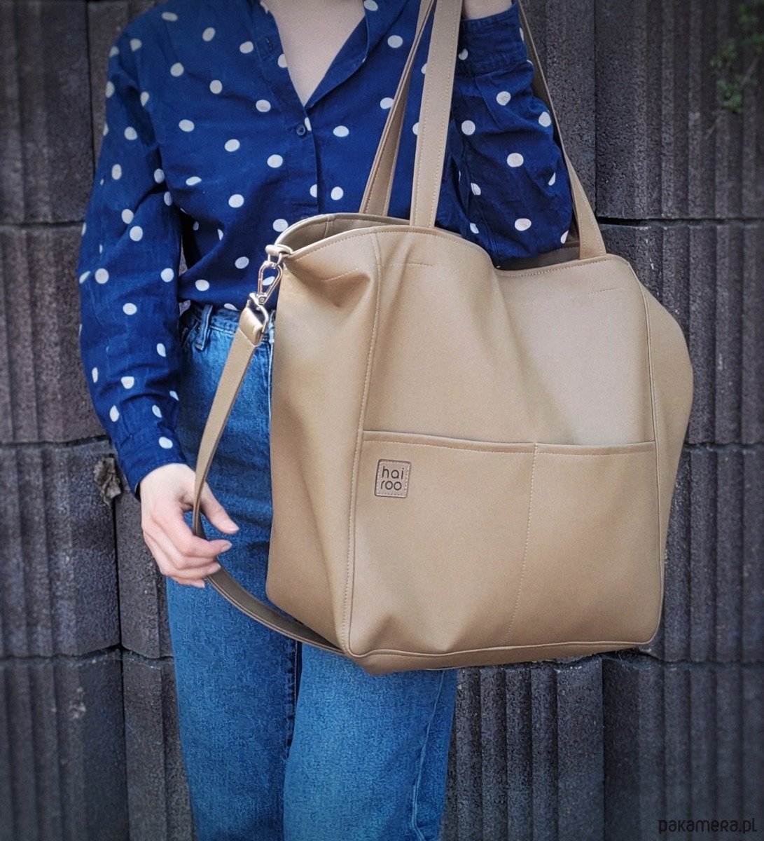 Lazy Bag Pocket to miejska torba oversize z dwoma kieszeniami z przodu. Prosty design i praktyczny charakter sprawia, że będzie twoją ulubioną torbą od rana do wieczora. To twoja wierna towarzyszka większych i mniejszych podróży. Została uszyta z miękkiej ekoskóry w kolorze ciemnobeżowym. Wnętrze zostało wykończone bawełnianą beżową podszewką. Torba miękko układa się na ramieniu, dodatkowo posiada regulowany pasek, jeśli potrzebujesz poczuć się swobodnie.