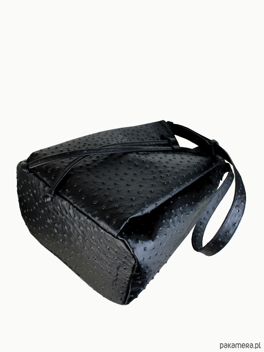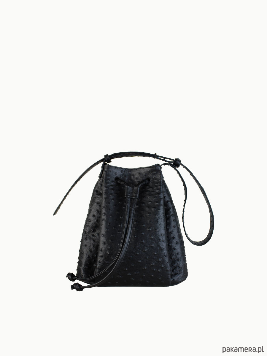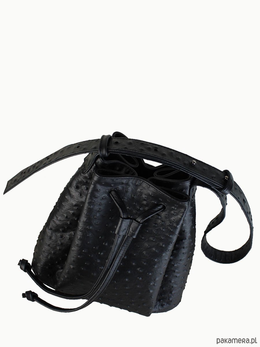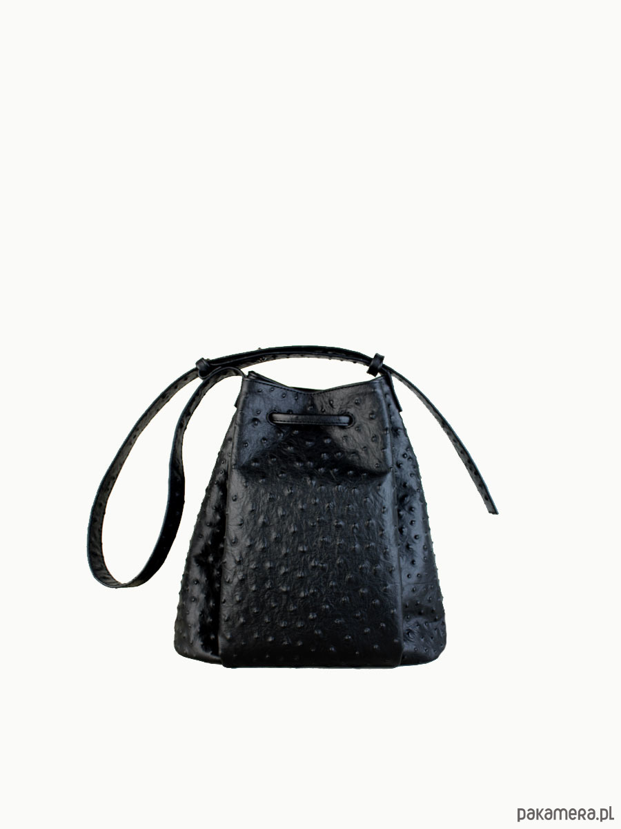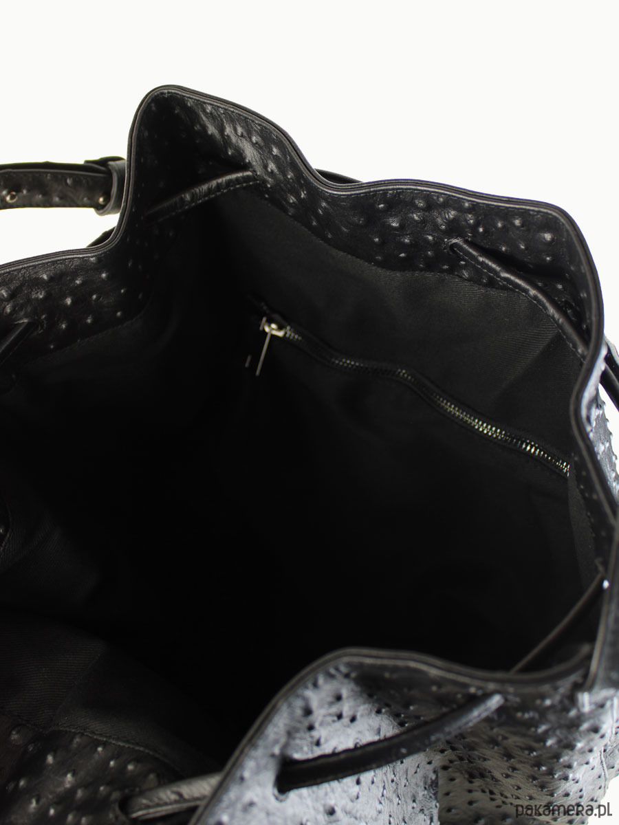 Worek “Le sac petite” wykonany z tłoczonej skóry na wzór strusia, wykończony mocną podszewką. W środku znajdziesz trzy kieszenie, jedną dużą podzieloną na pół i jedną średniej wielkości zapinaną na suwak. Metalowe półkółko do którego możesz doczepić klucze lub smycz. Dno dodatkowo wzmocnione podwójną warstwą skóry aby utrzymać kształt torby po wypełnieniu. Pasek regulowany. Spokojnie pomieści rzeczy o wymiarze A5.