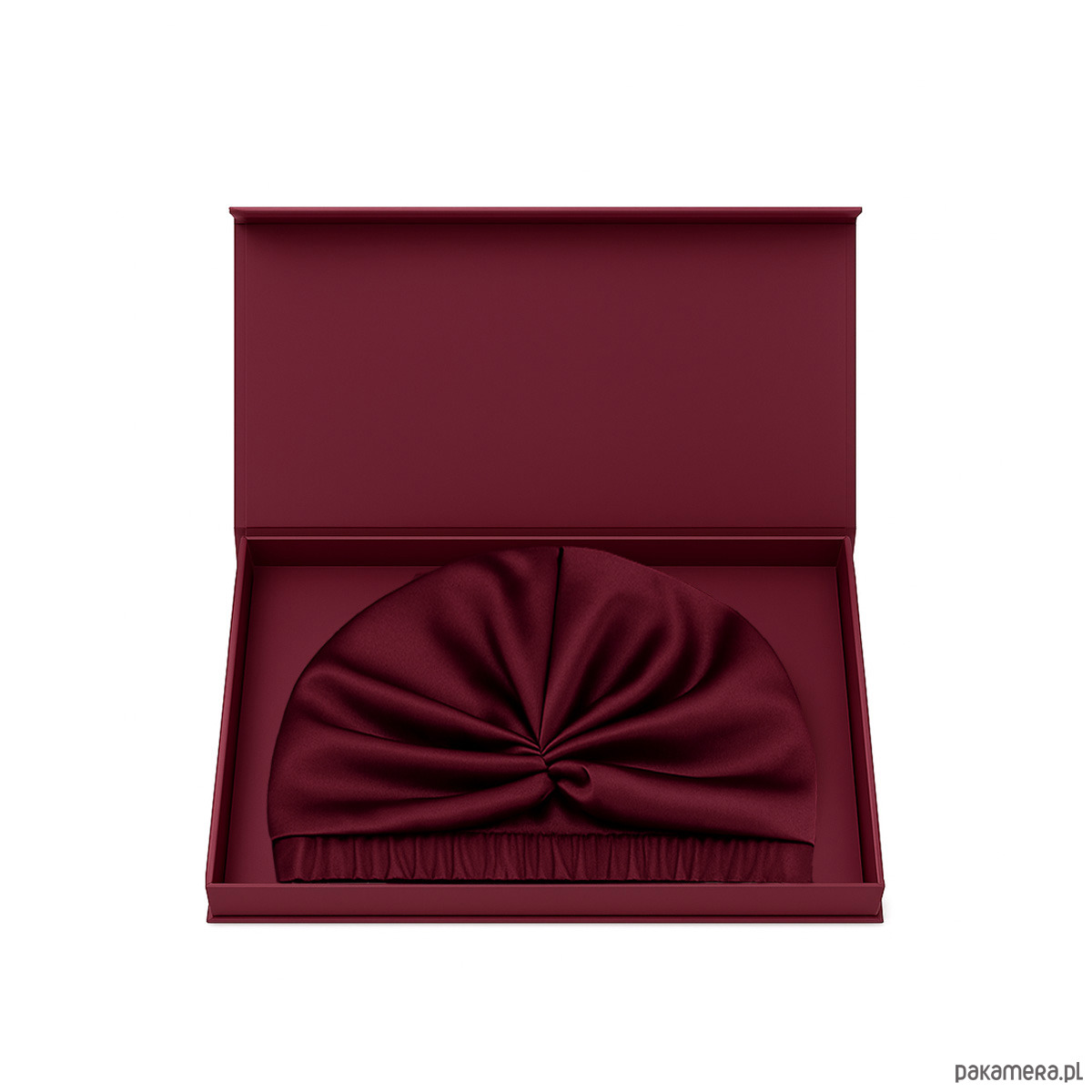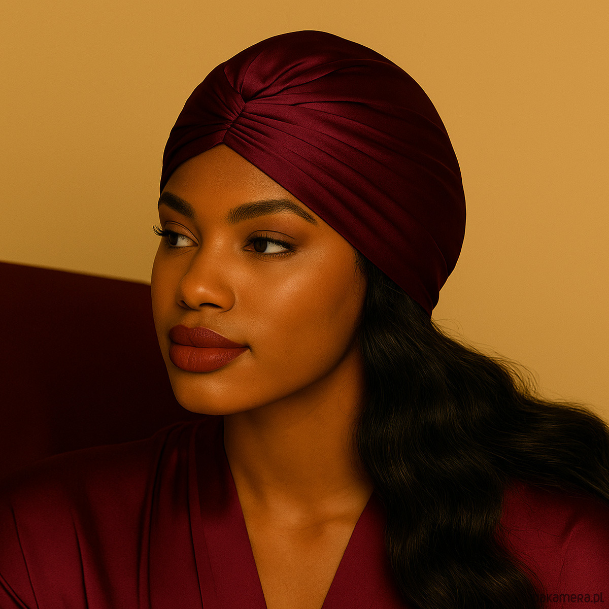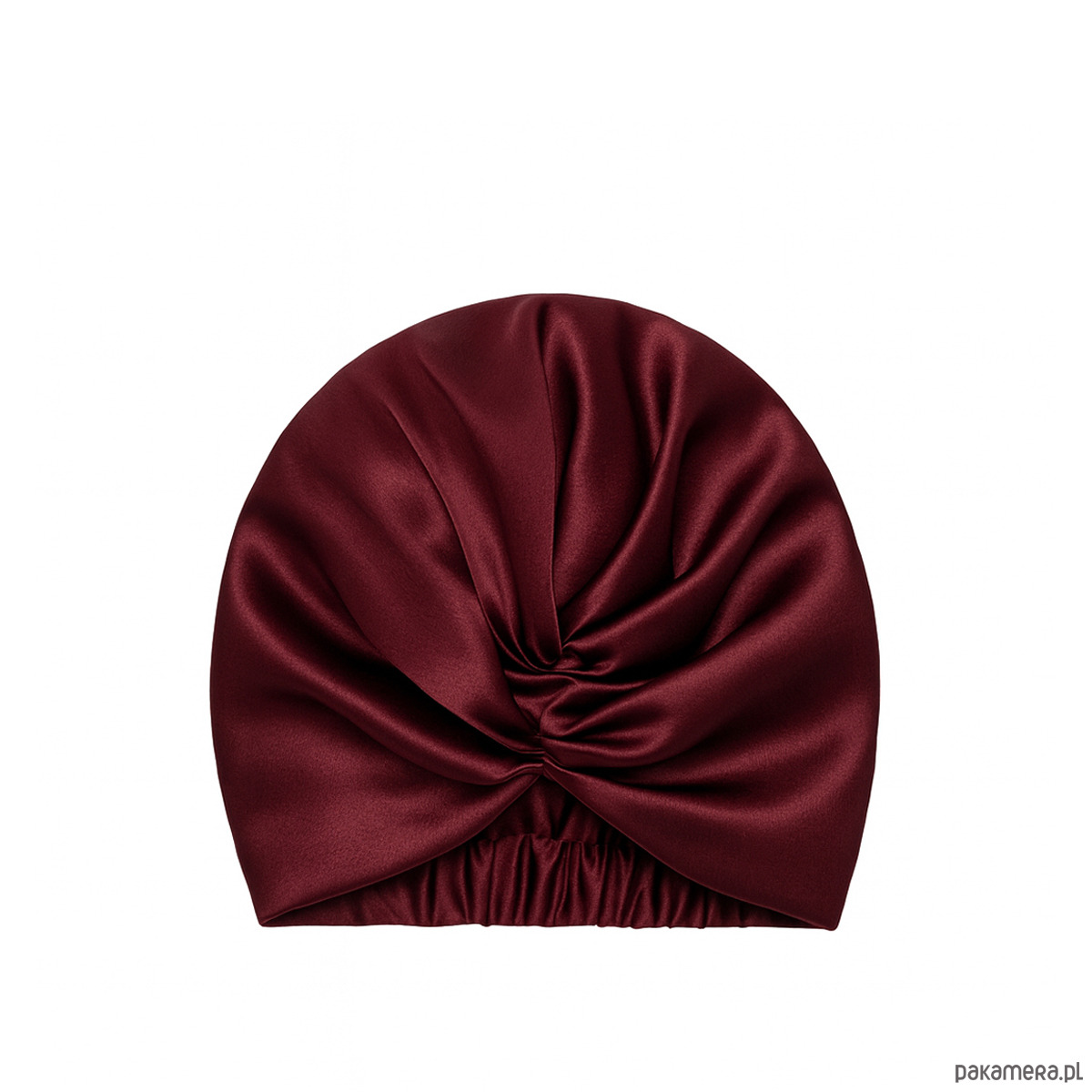 Elastyczna konstrukcja i rozmiar uniwersalny pozwalają na idealne dopasowanie, zapewniając komfort, delikatne utrzymanie fryzury oraz pełną swobodę ruchu. Dzięki subtelnemu połyskowi jedwabiu i głębokiej barwie burgundu, turban prezentuje się elegancko nawet nocą — bo piękno warto celebrować w każdej chwili.