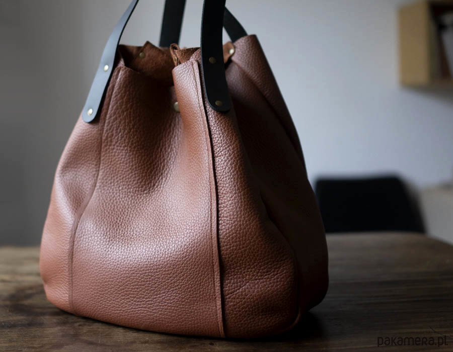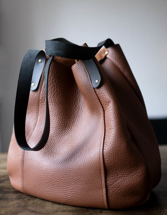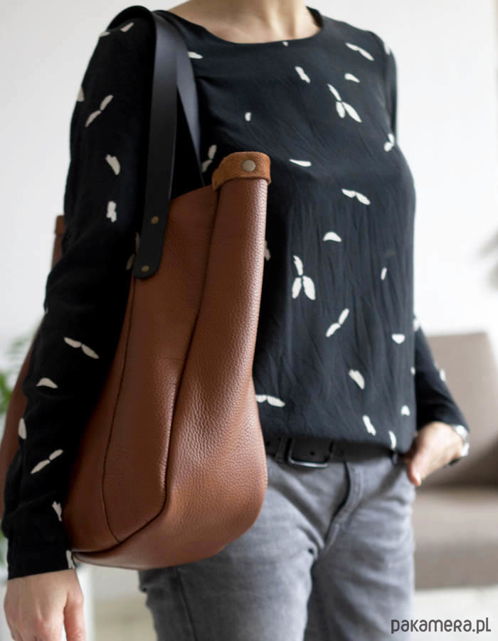 Duża workowa torba na ramię i do ręki. Wykonana z brązowej skóry. Uchwyty z czarnej sztywnej skóry. Zamykana na 2 magnesy. Zamknięcie z boków u góry zmniejsza torbę do formy przypominającej sakwę. Zmieści bez problemu format A4. Torba nie posiada podszewki, środek to lewa strona skóry, zamszowa. Wymiary: wysokość torby: na środku 33 cm, z boku 38 cm., szerokość u góry na płasko z bokami 46 cm, u dołu 36 cm, głębokość 12 cm. Długość uchwytów 52 cm . Dodatki metalowe w kolorze starego złota. Czas oczekiwania na wykonanie tej torebki : ok 3 dni.