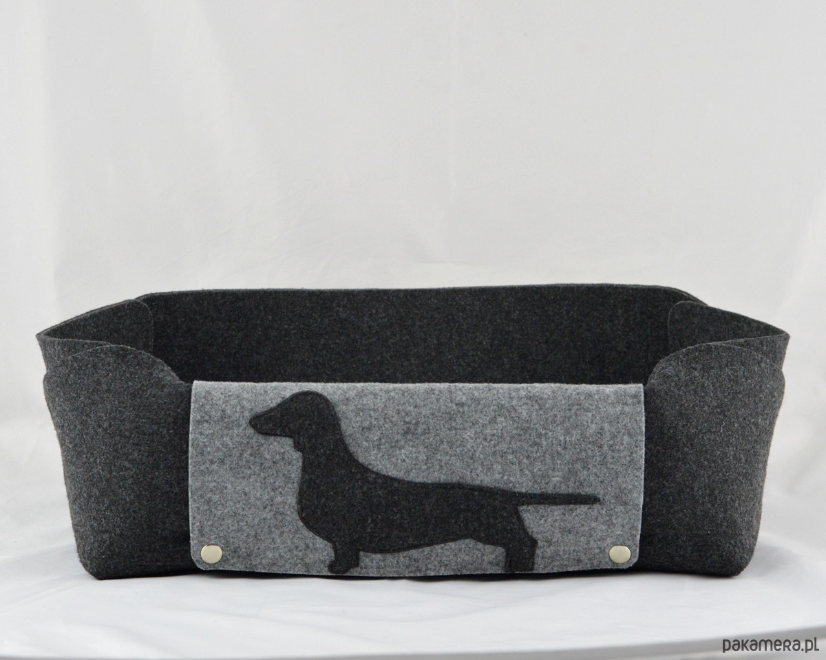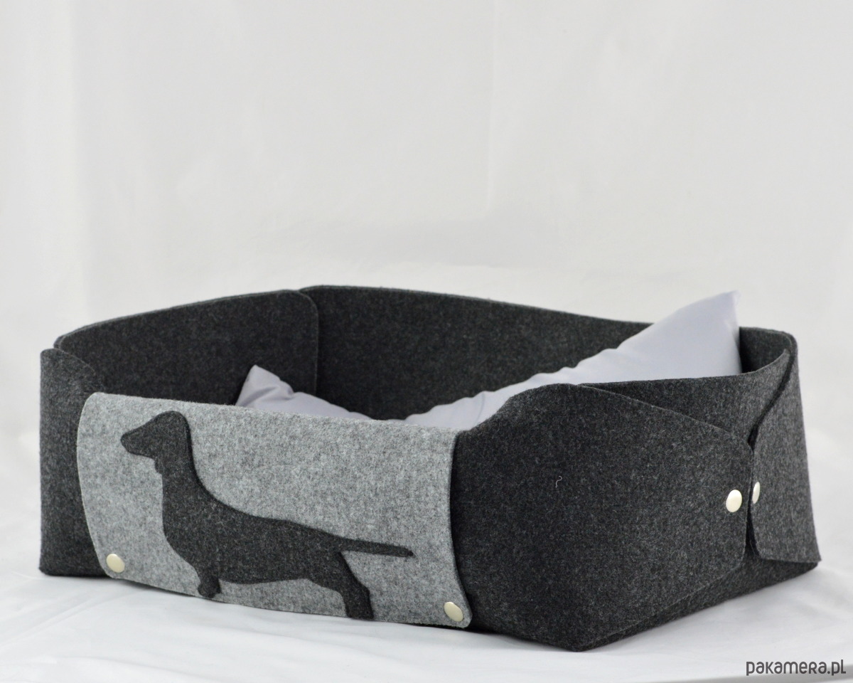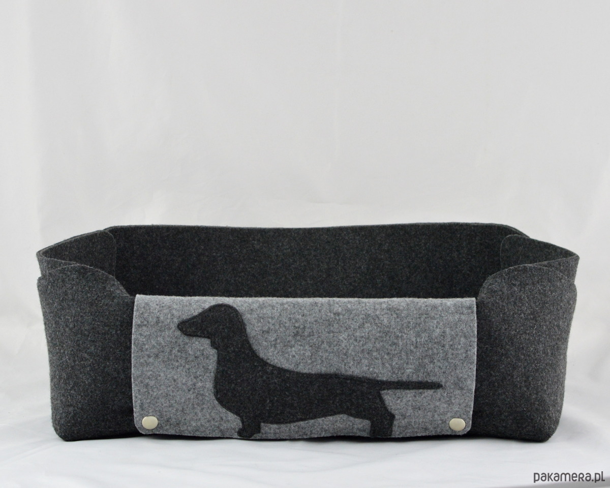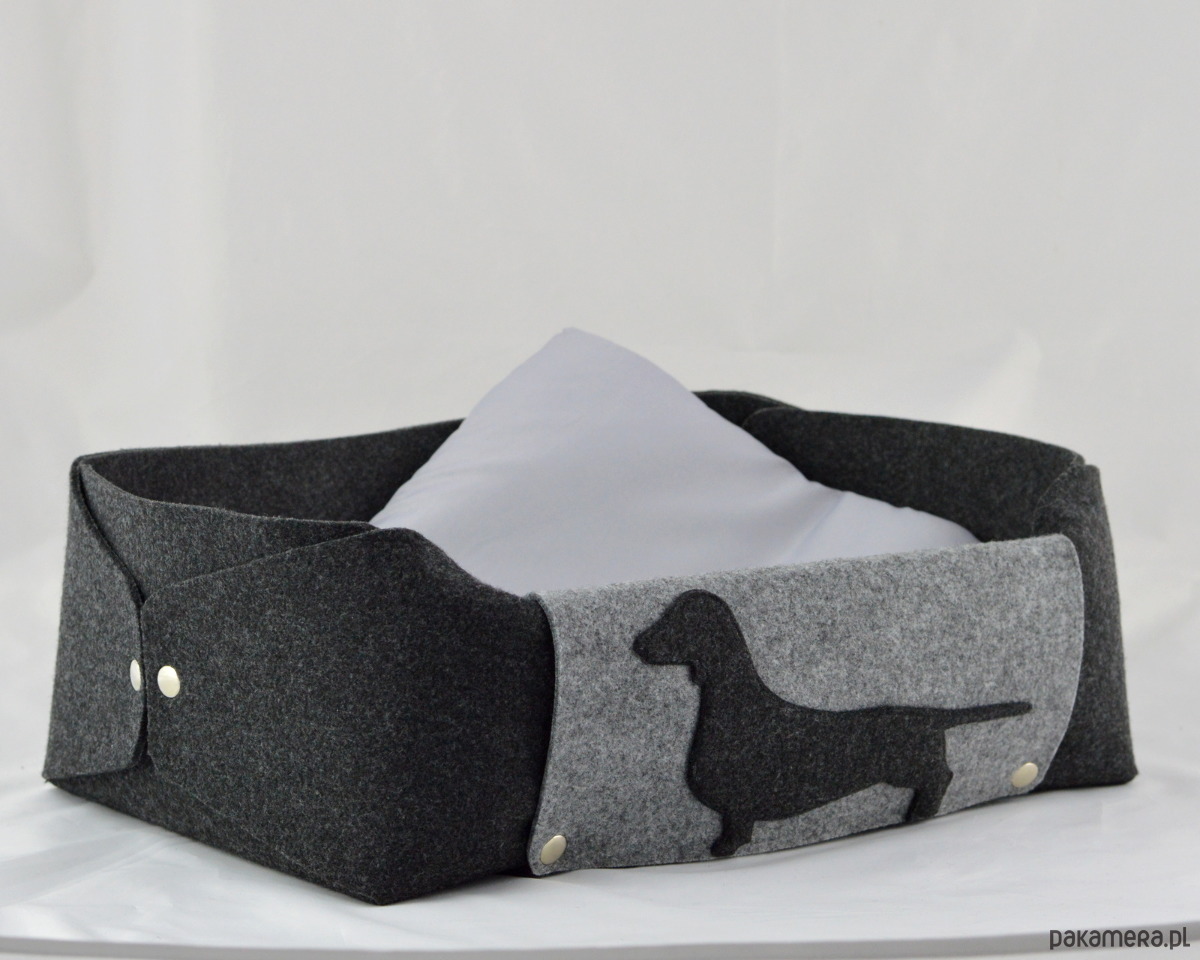 Legowisko zostało wykonane z grubego, mocnego filcu. Jest naprawdę bardzo urocze i solidne! Wielkość - około 35x48 cm, wysokość 15cm. Legowisko zostało wykonane z dbałością o każdy szczegół - jest spinane na estetyczne metalowe napy. Łatwo jest je rozłożyć na płasko. Szara patka, na której jest przyszyta aplikacja jamnika, jest z jednej strony odpinana - można ją położyć na płasko we wnętrzu pudełka - pod poduszką. Do legowiska jest dołączona poduszka dla pieska w kolorze szarym.
