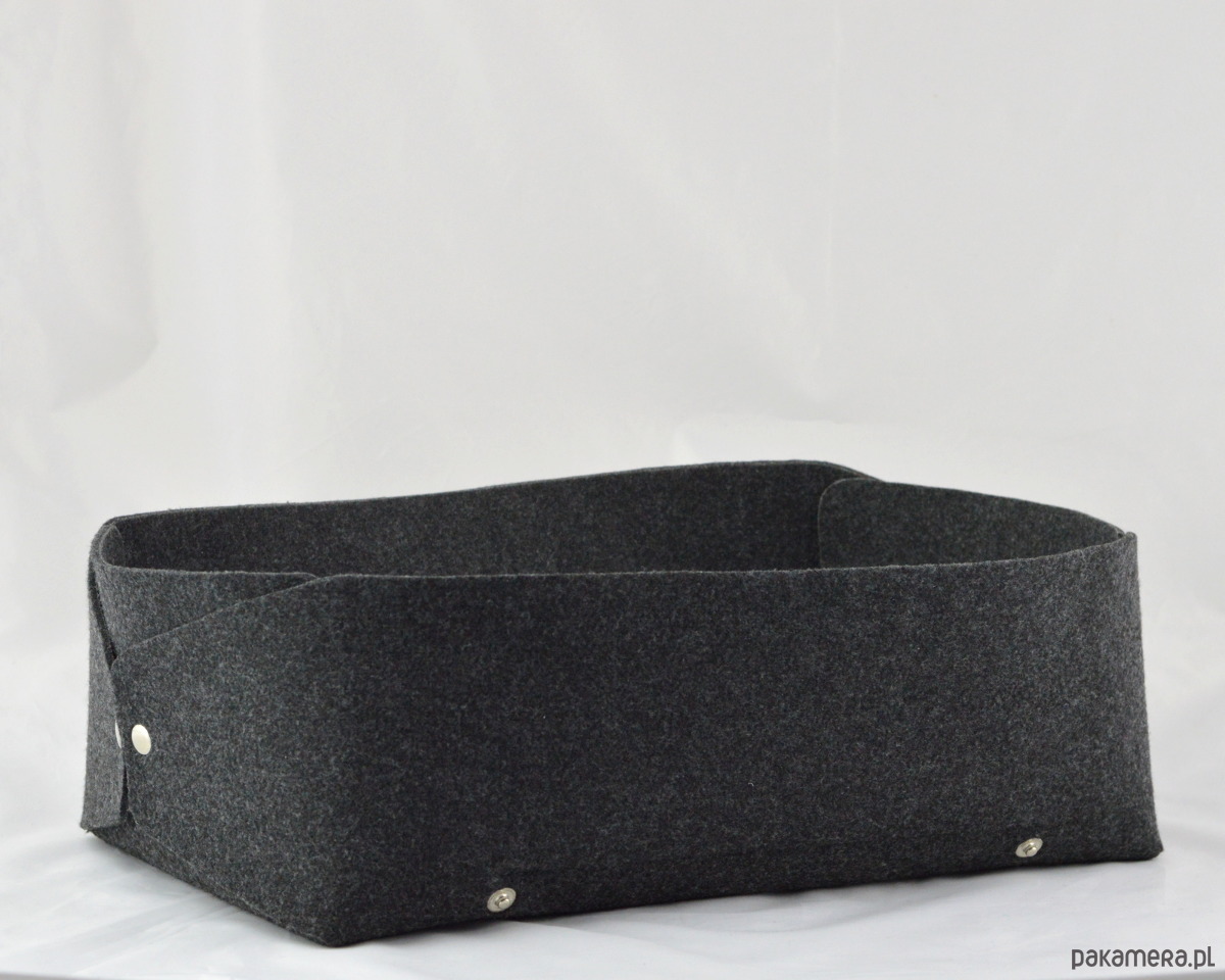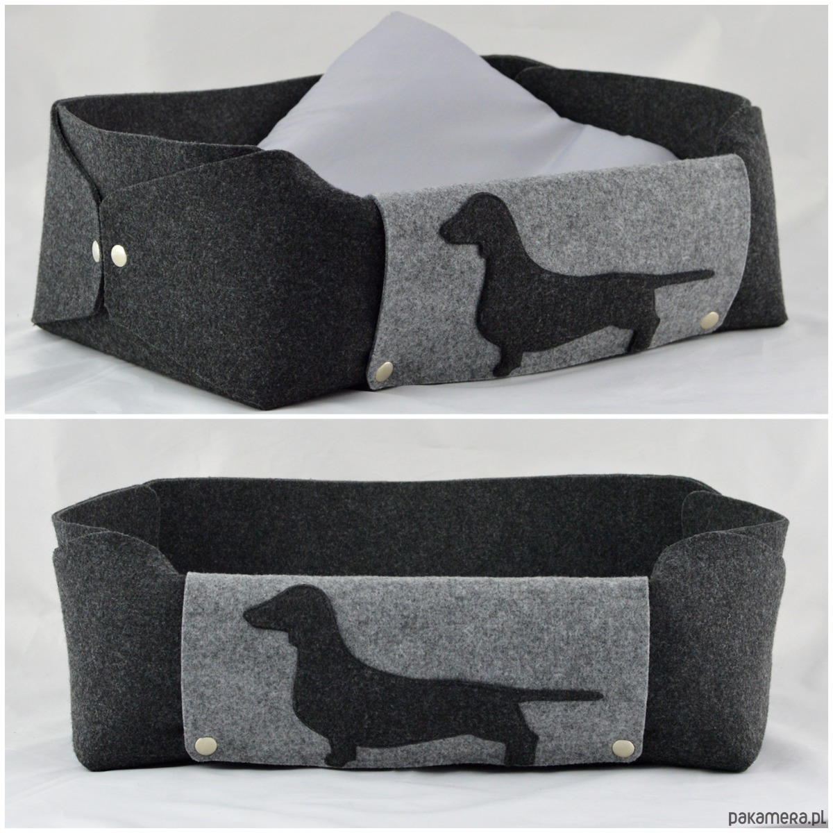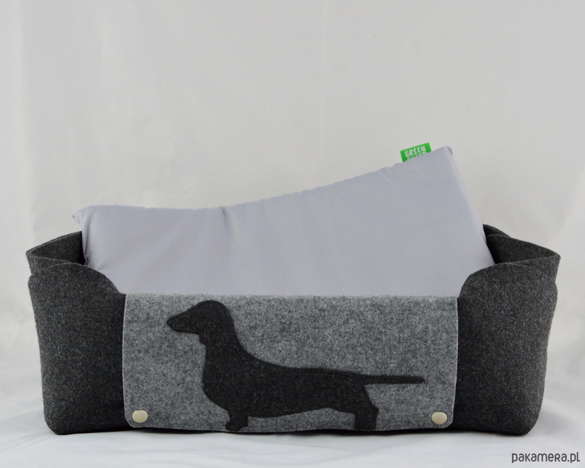 Legowisko zostało wykonane z grubego, mocnego filcu. Jest naprawdę bardzo urocze i solidne! Wielkość - około 35x48 cm, wysokość 15cm. Legowisko zostało wykonane z dbałością o każdy szczegół - jest spinane na estetyczne metalowe napy. Łatwo jest je rozłożyć na płasko. Szara patka, na której jest przyszyta aplikacja jamnika, jest z jednej strony odpinana - można ją położyć na płasko we wnętrzu pudełka - pod poduszką. Do legowiska jest dołączona poduszka dla pieska w kolorze szarym.