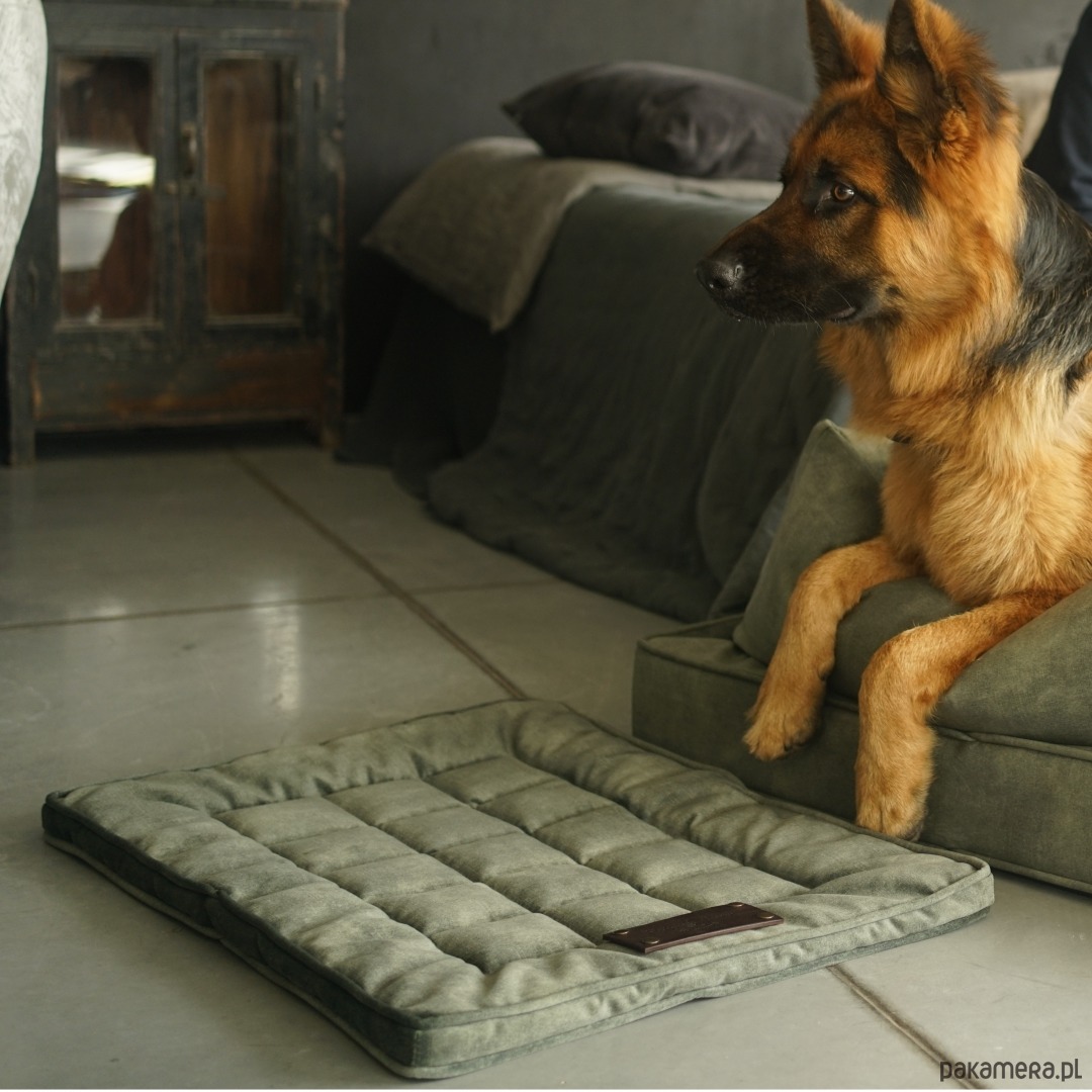 Elegancka poduszka / legowisko powstała z myślą o psiakach, które nie lubią czuć się ograniczone na swoim posłaniu. Dzięki temu, że legowisko nie posiada boczków czworonogi mają możliwość swobodnego wyciągnięcia się na posłaniu. Jak w każdym z naszych produktów dołożyliśmy wszelkich starań aby zapewnić maksimum komfortu oraz podtrzymać niepowtarzalny design. Pokrowiec został uszyty z wysokiej jakości tkanin tapicerskich z certyfikatem Oeko-Tex®. Wyjątkowy charakter podkreśliliśmy elementami ze skóry bydlęcej ( logo, które łatwo można zdemontować). Zastosowana tkanina welurowa charakteryzuje się odpornością na ścieranie i zabrudzenia. W większości przypadków zanieczyszczony materiał wystarczy przetrzeć wilgotną szmatką. Wnętrze poduchy stanowi włóknina wysokopuszysta, która charakteryzuje się dużą sprężystością. Jest lekka, przewiewna i odporna na odkształcenia. Całość zaprojektowana z dbałością o najmniejszy szczegół – tak aby produkt był komfortowy zarówno dla użytkownika jak i właścicieli czworonogów. Niespotykany design wraz ze skórzanymi dodatkami dopełni i wpisze się w każde wnętrze niezależnie od panującego w nim stylu.