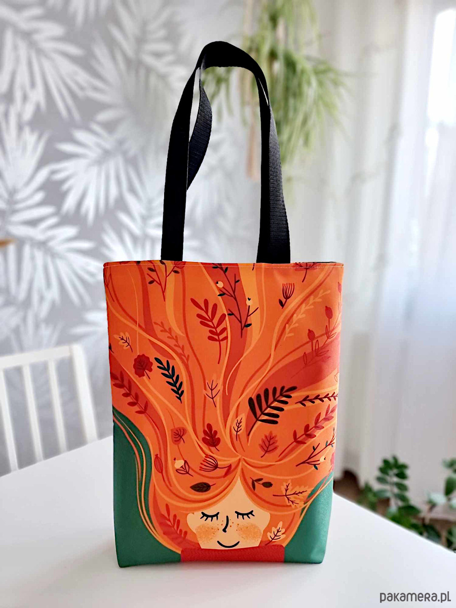 Lekka wodoodporna torba na zakupy to doskonałe połączenie stylu i funkcjonalności. Z jednej strony torby znajduje się unikalny wizerunek kobiety z rudymi włosami. Druga strona torby to kolorowy, malowniczy las, który wprowadza nutę natury do codziennych zakupów.