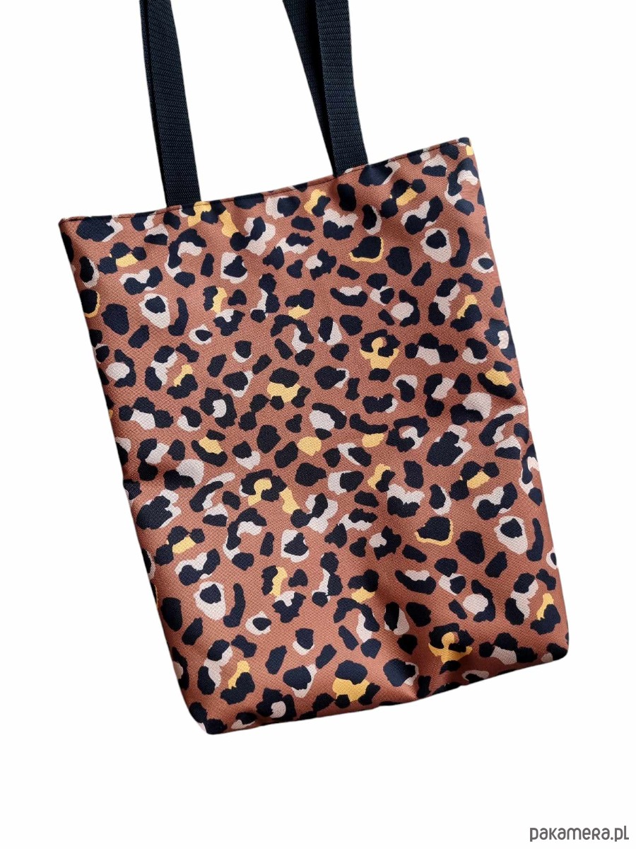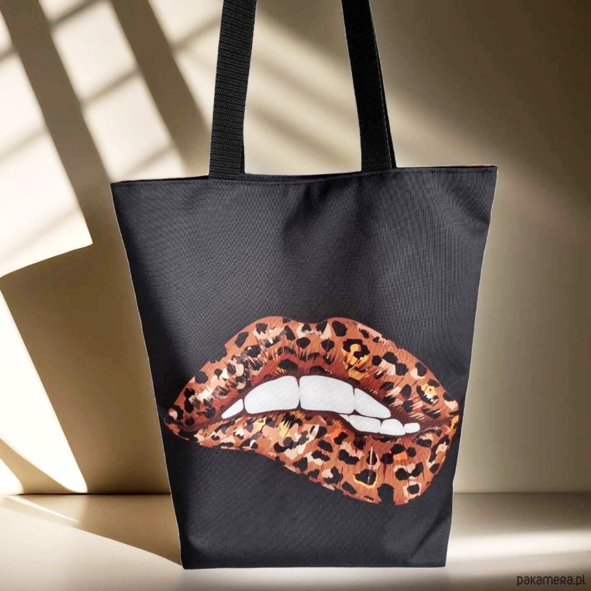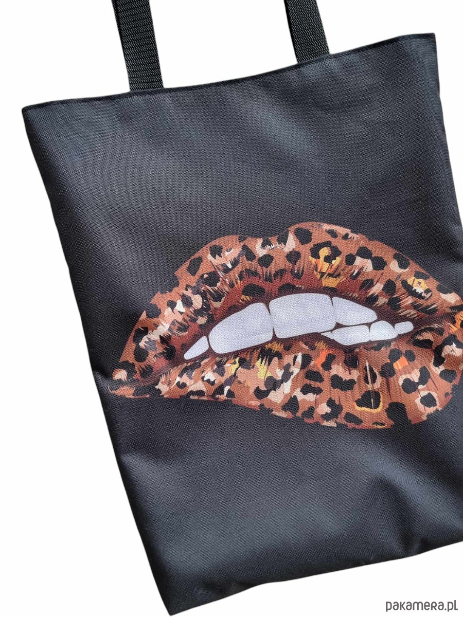 Lekka wodoodporna torba na zakupy lub na co dzień. Z jednej strony torby znajduje się wzór panterkowych ust. Druga strona torby to wzór panterki.
