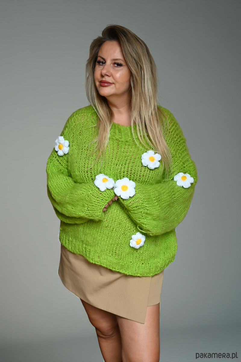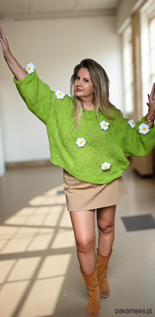 Lekki limonkowy sweter mgiełka ze stokrotkami
