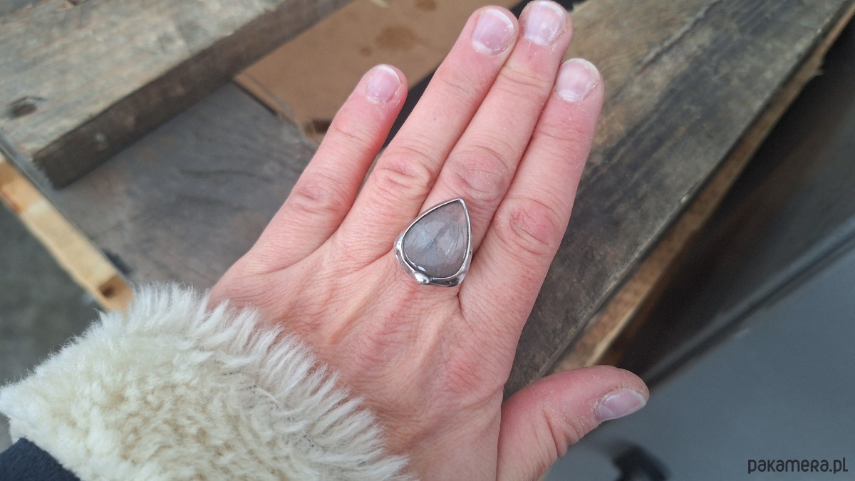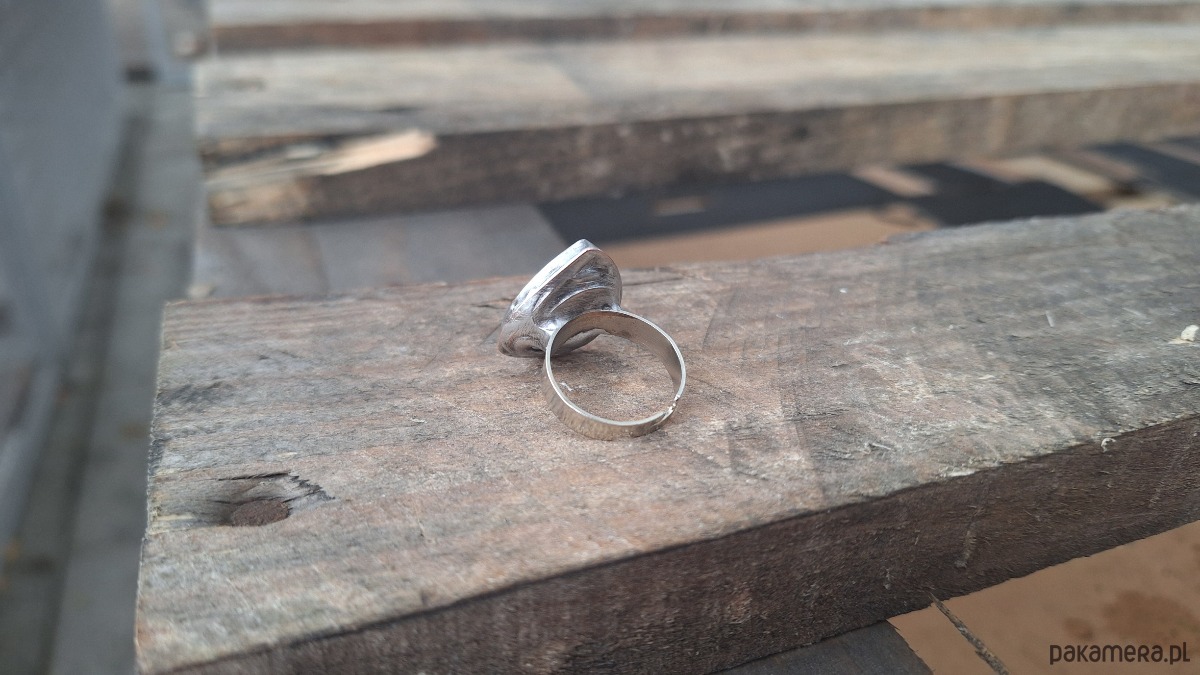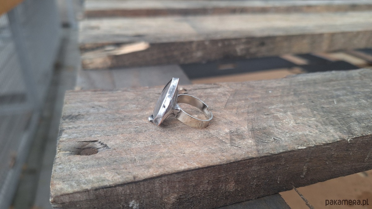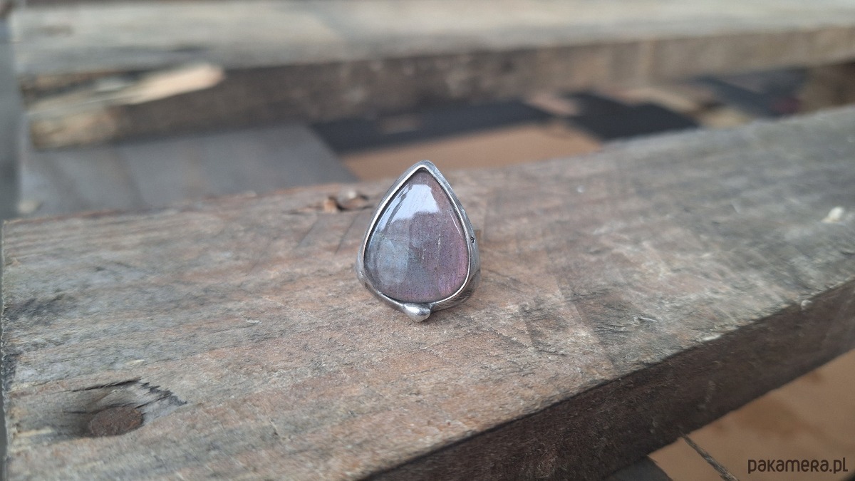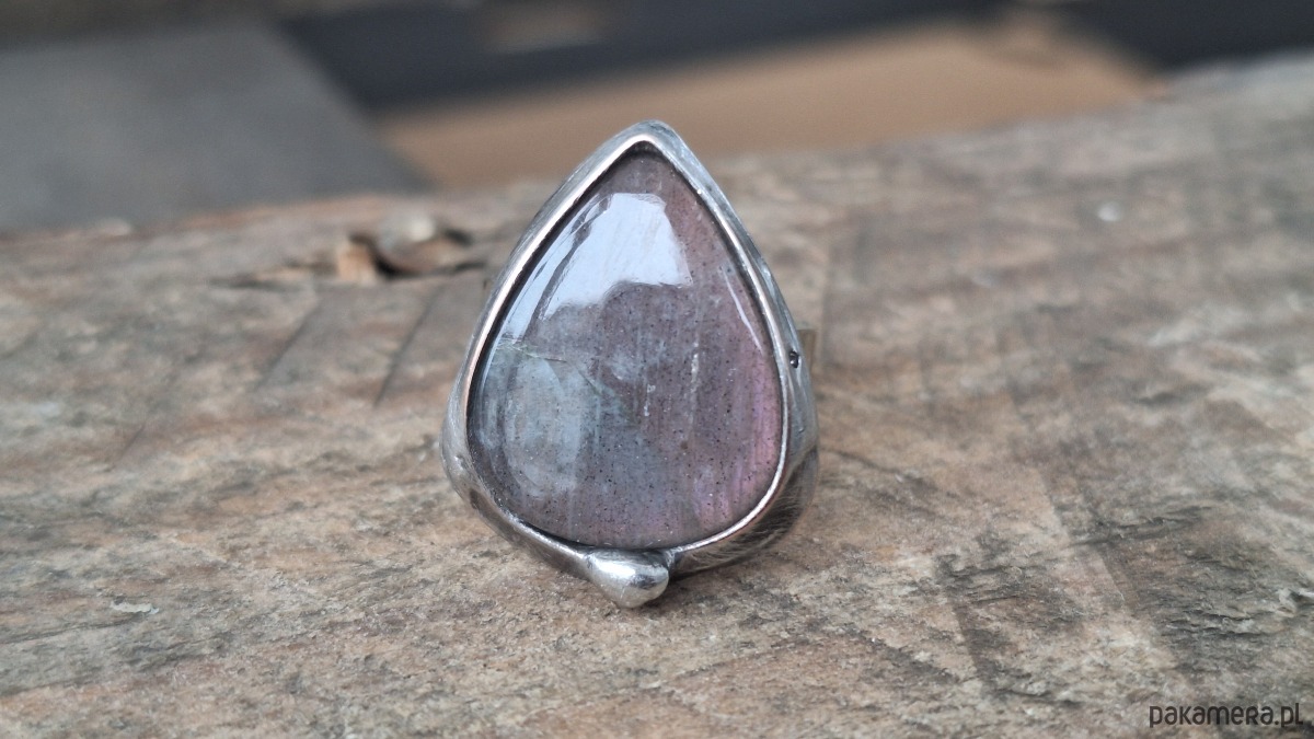 Pierścionek wykonany z miedzi, cyny i labradorytu. Wymiary ok. 2.2 na 1.7 cm. Regulowany. Nie jest ciężki.