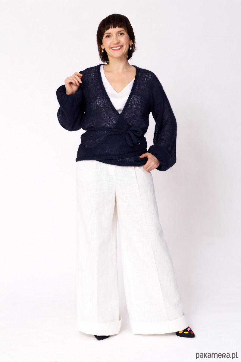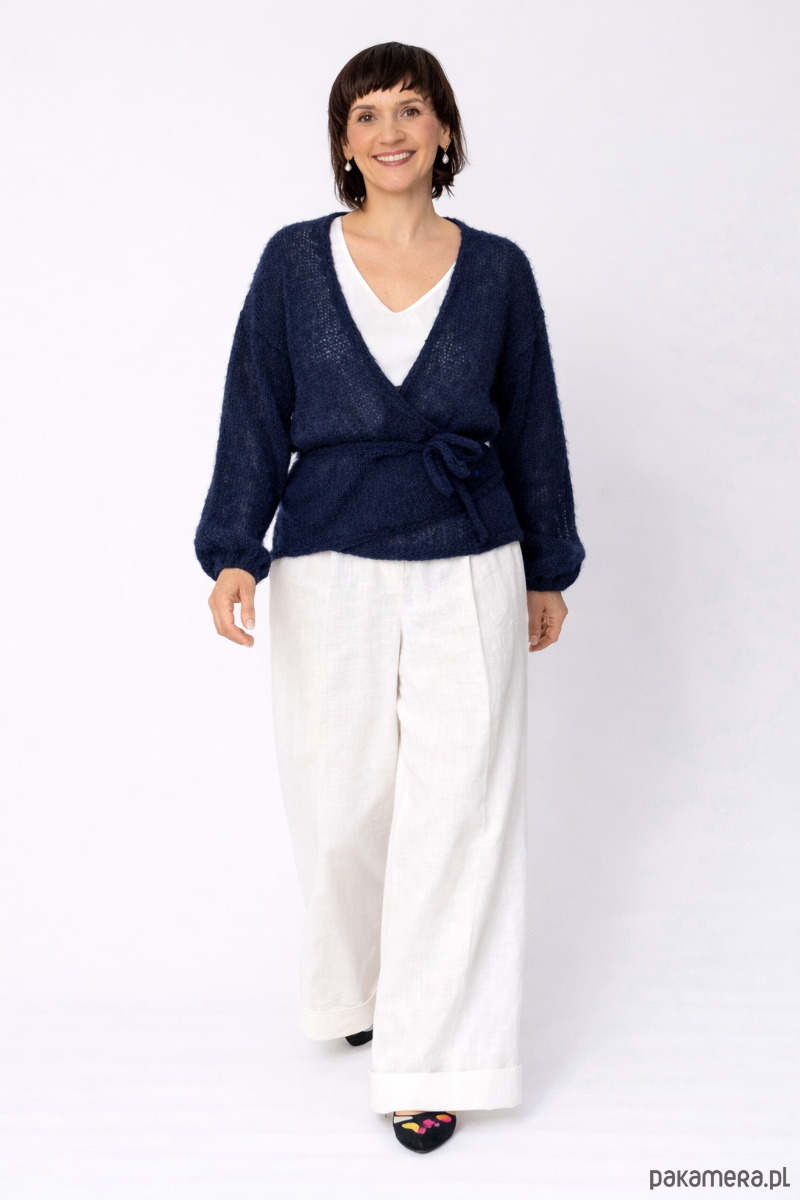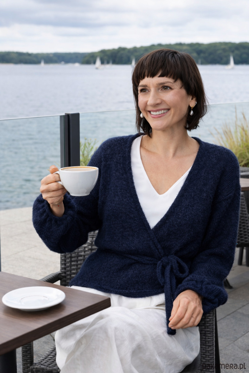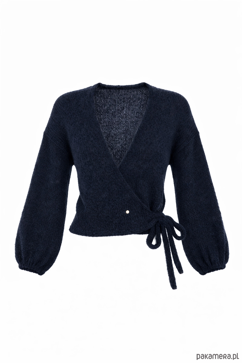 Elegancki damski kardigan z wełny alpaki, który łączy kobiecy styl z wygodą. Miękka, lekka dzianina i kopertowy fason wiązany w talii pięknie podkreślają sylwetkę, a bufiaste rękawy nadają całości modowego charakteru.