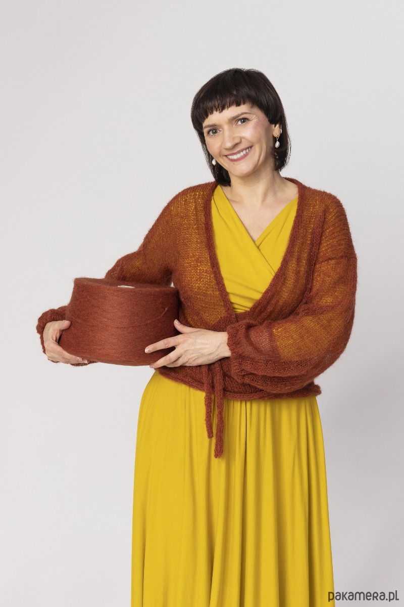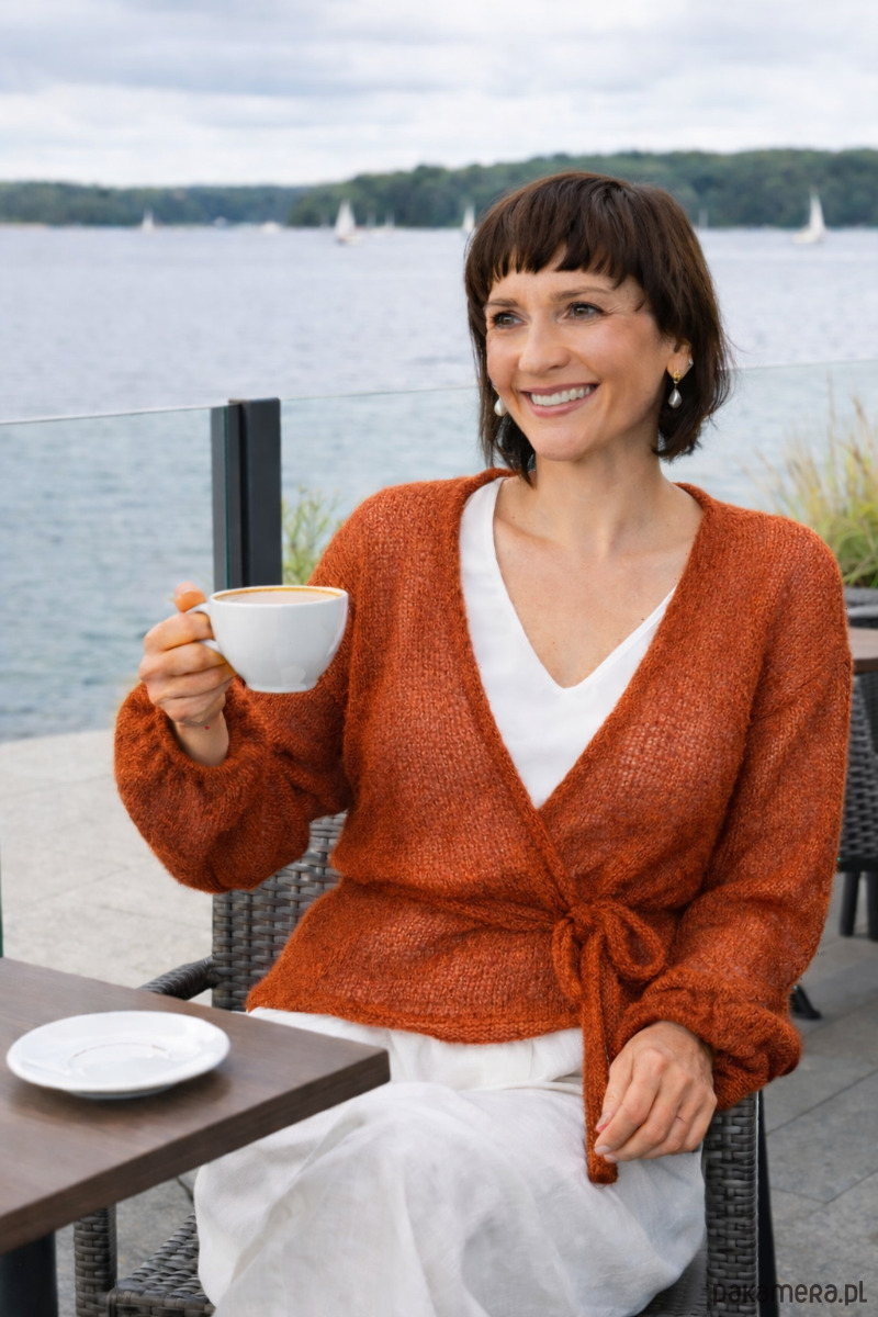 Elegancki damski kardigan z wełny alpaki, który łączy kobiecy styl z wygodą. Miękka, lekka dzianina i kopertowy fason wiązany w talii pięknie podkreślają sylwetkę, a bufiaste rękawy nadają całości modowego charakteru.