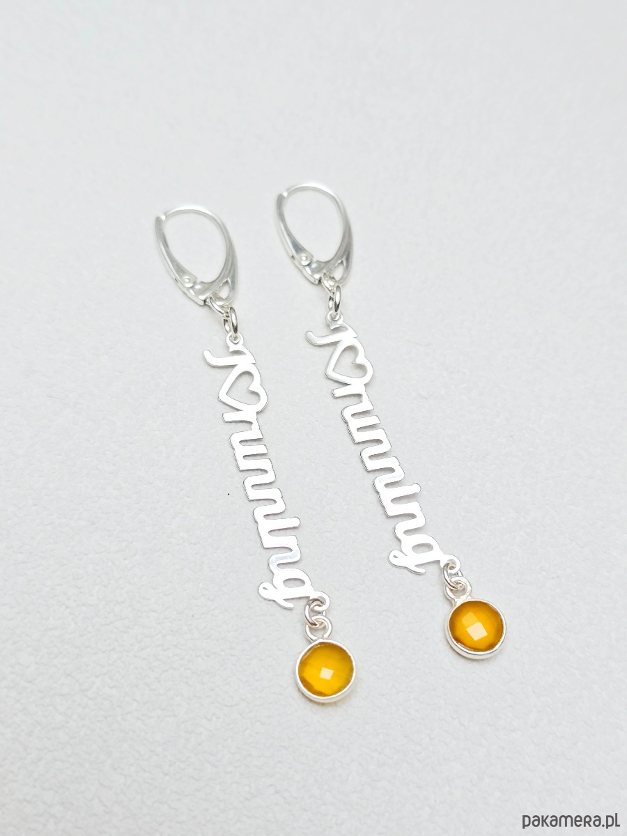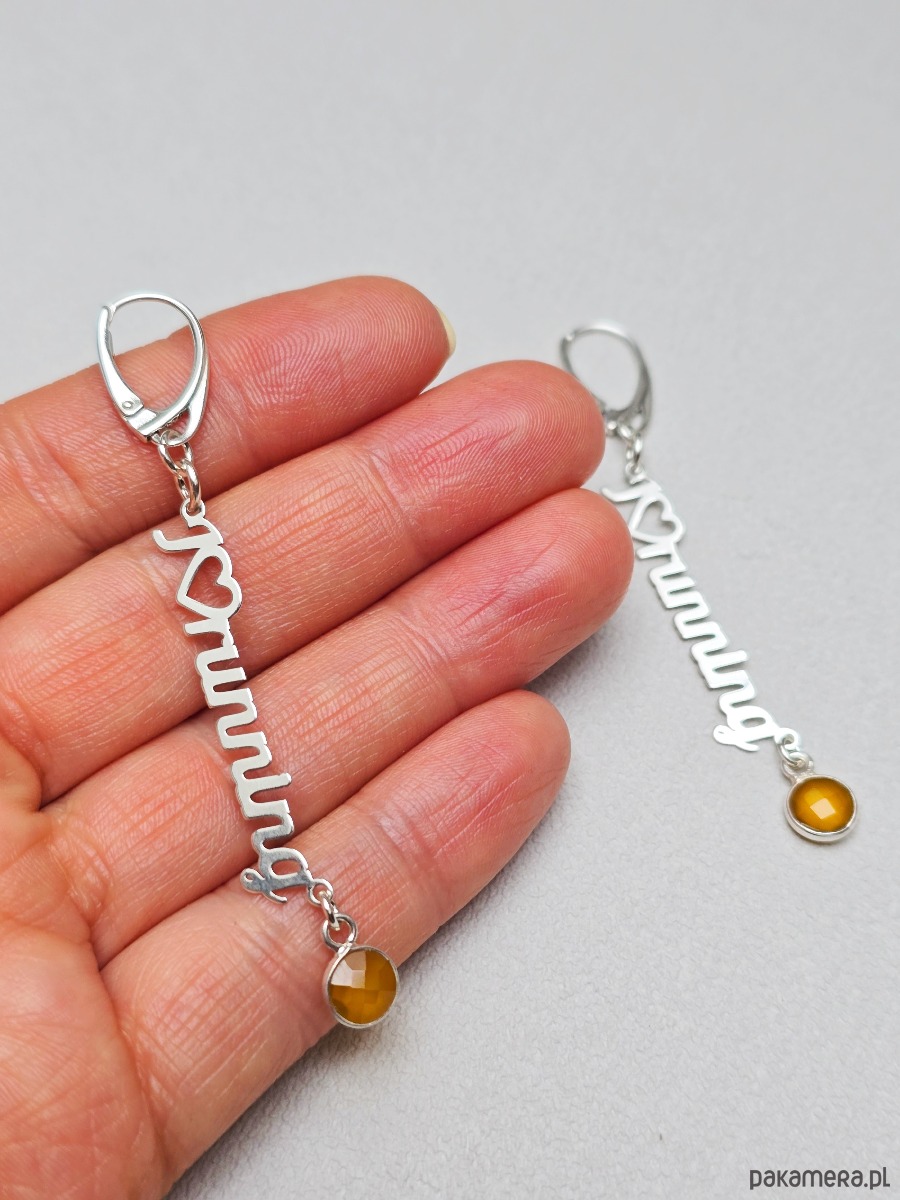 Wyjątkowe, lekkie kolczyki na biglach angielskich z blaszkami z napisem I Love Running i żółtymi 6mm chalcedonami w okuciu srebrnym.