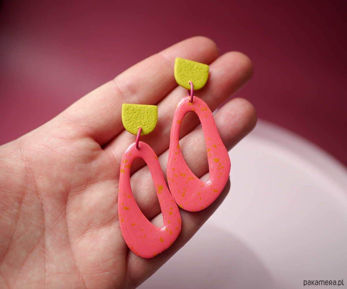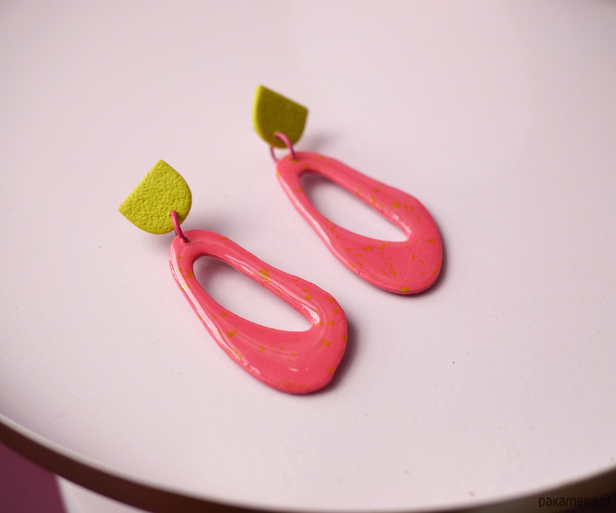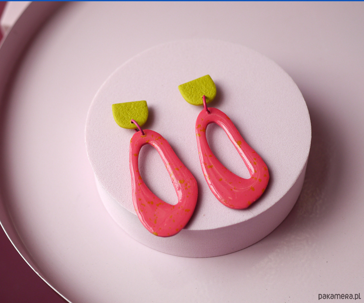 Oryginalne i efektowne kolczyki wykonane ręcznie z glinek polimerowych, pokryte żywicą epoksydową, która nadaje połysku i trwałości.