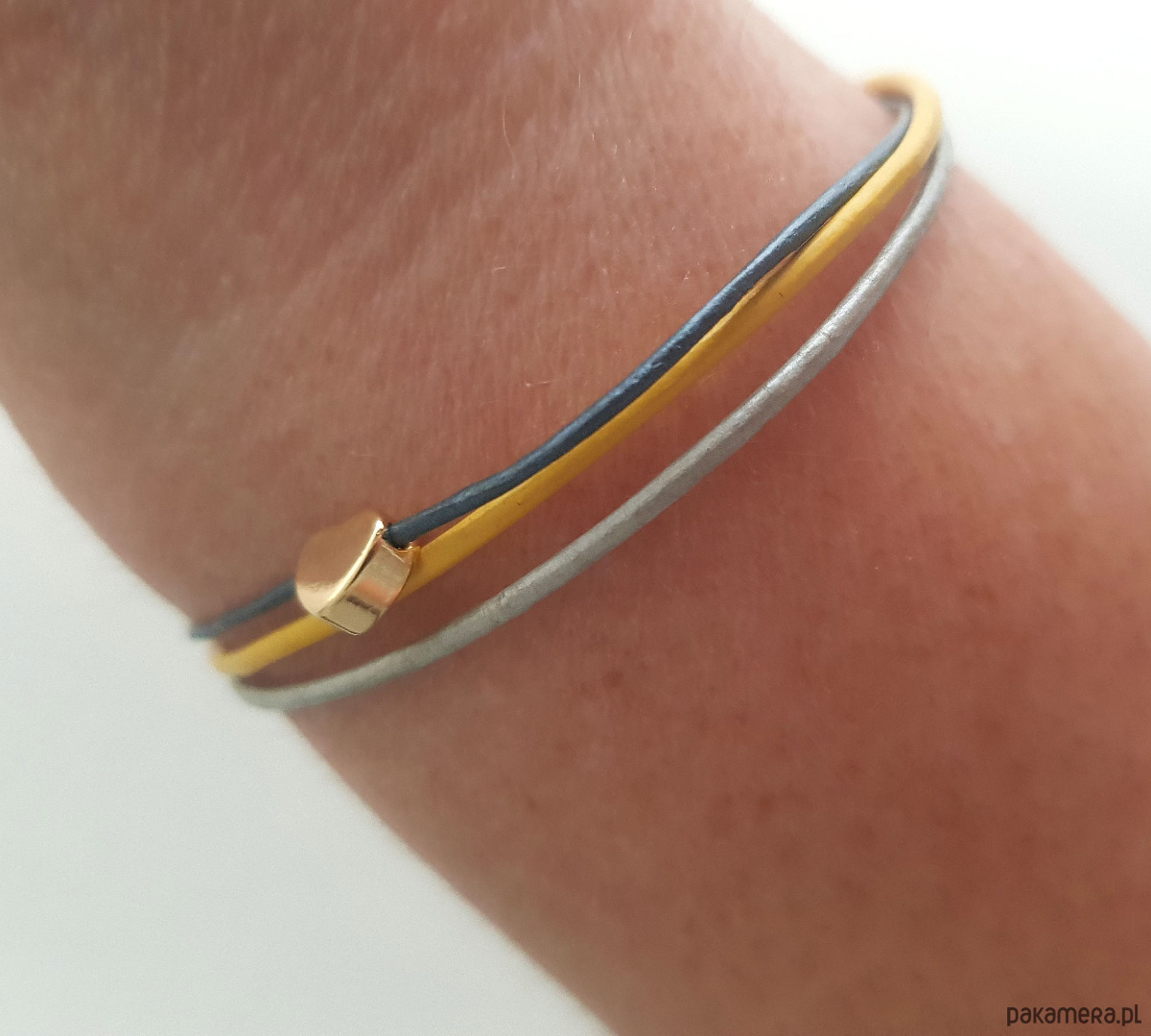 Wykonana z cieniutkich rzemyków, żółtego, jasno szarego i ciemno szarego.