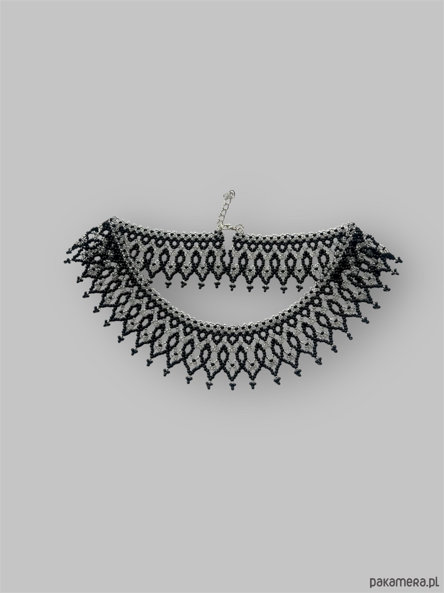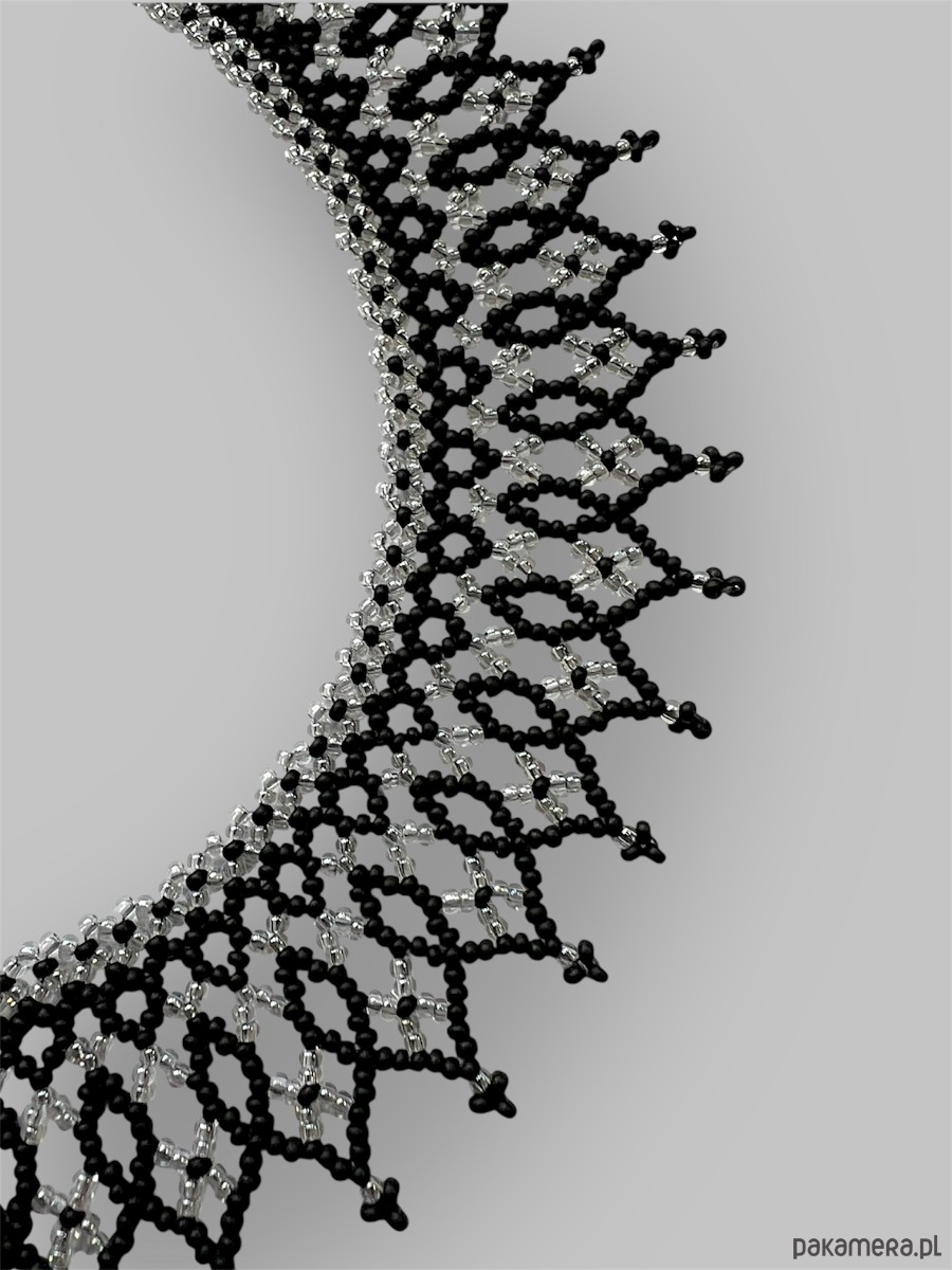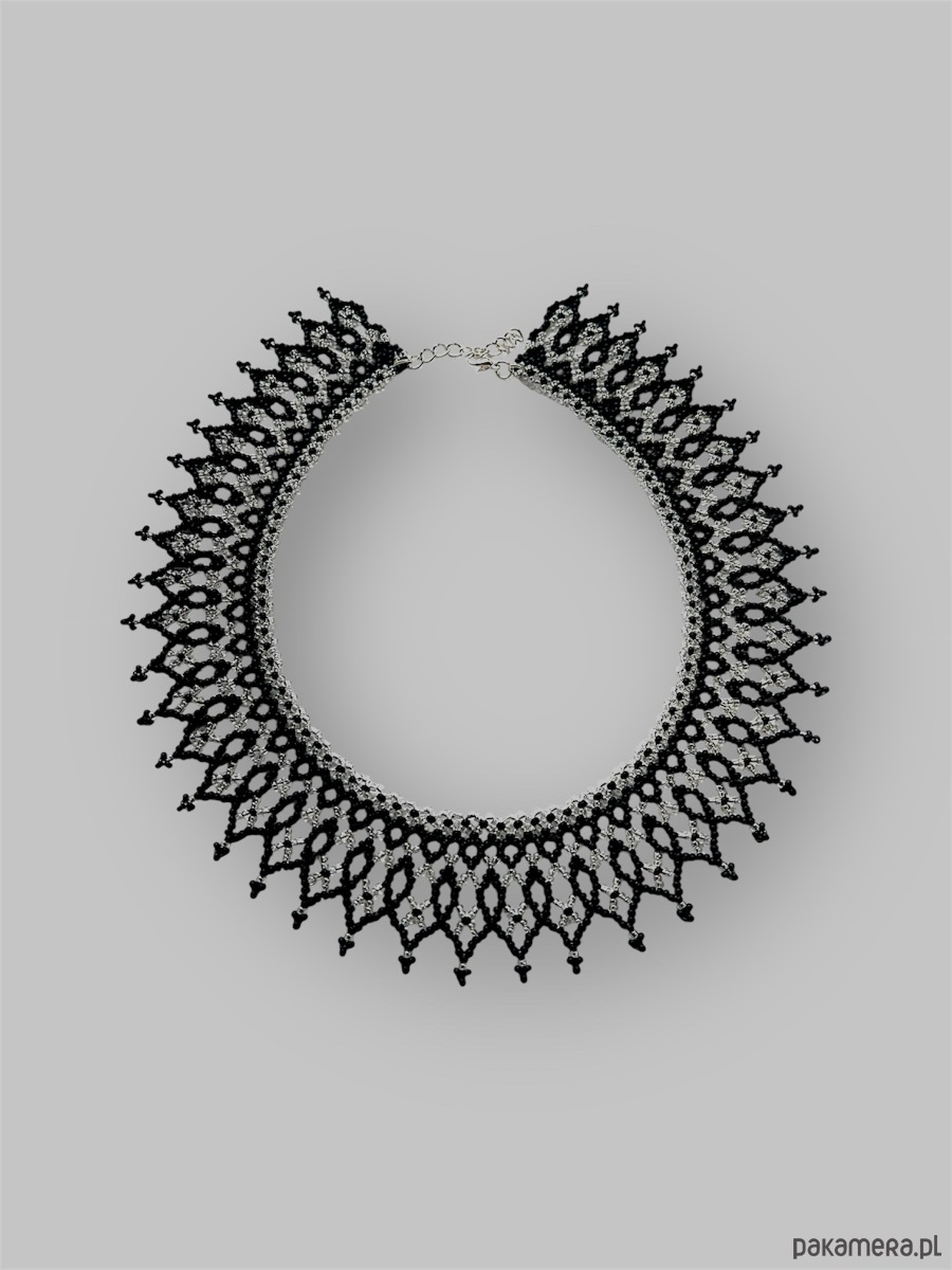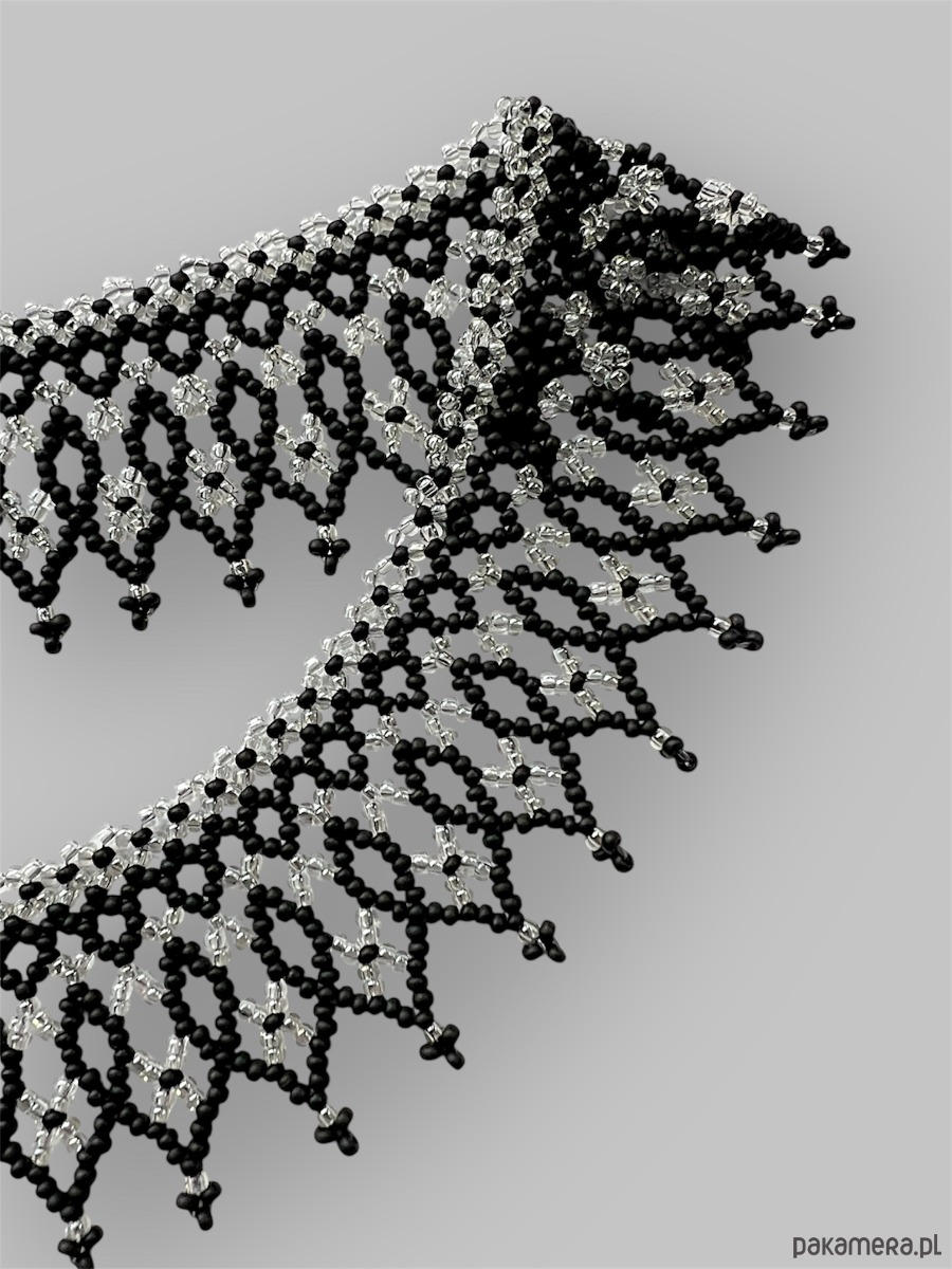 Ornament wykonany jest czarnym kolorem na bezbarwnym tle, co nadaje biżuterii lekkości, kontrastu i ponadczasowej elegancji. Całość powstała z wysokiej jakości czeskiego koralika, znanego z trwałości i pięknego wykończenia.