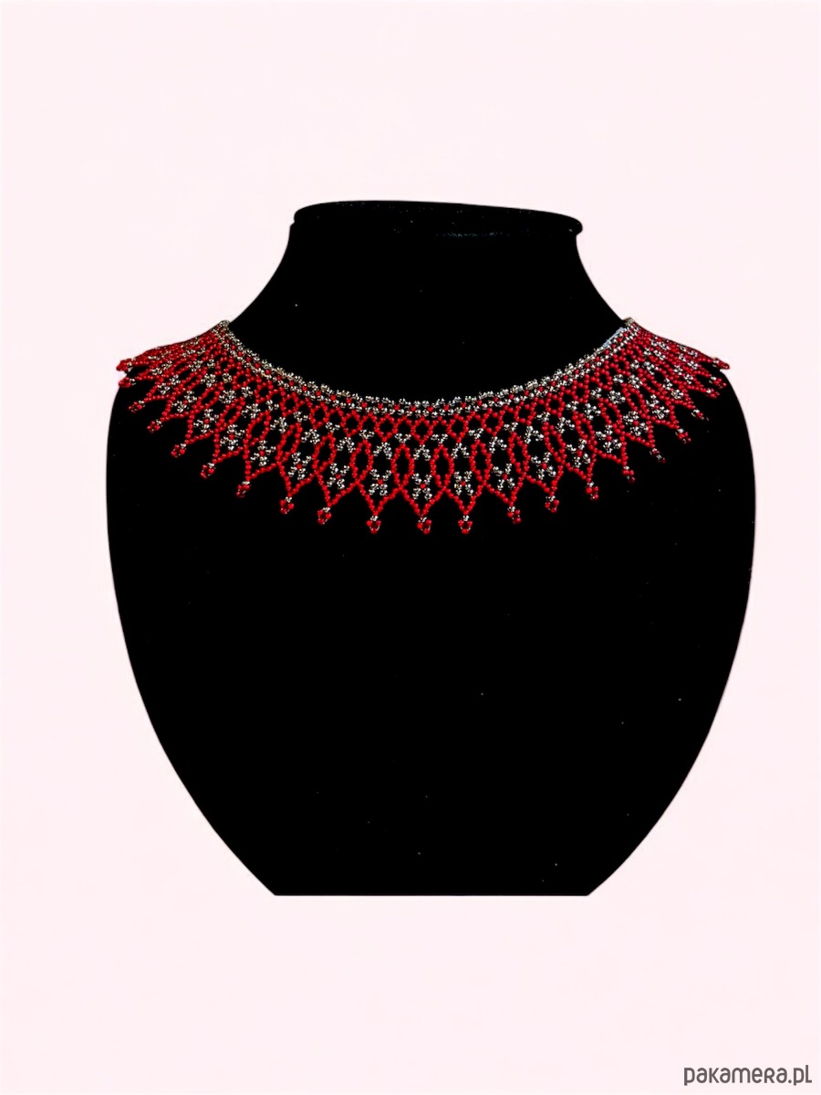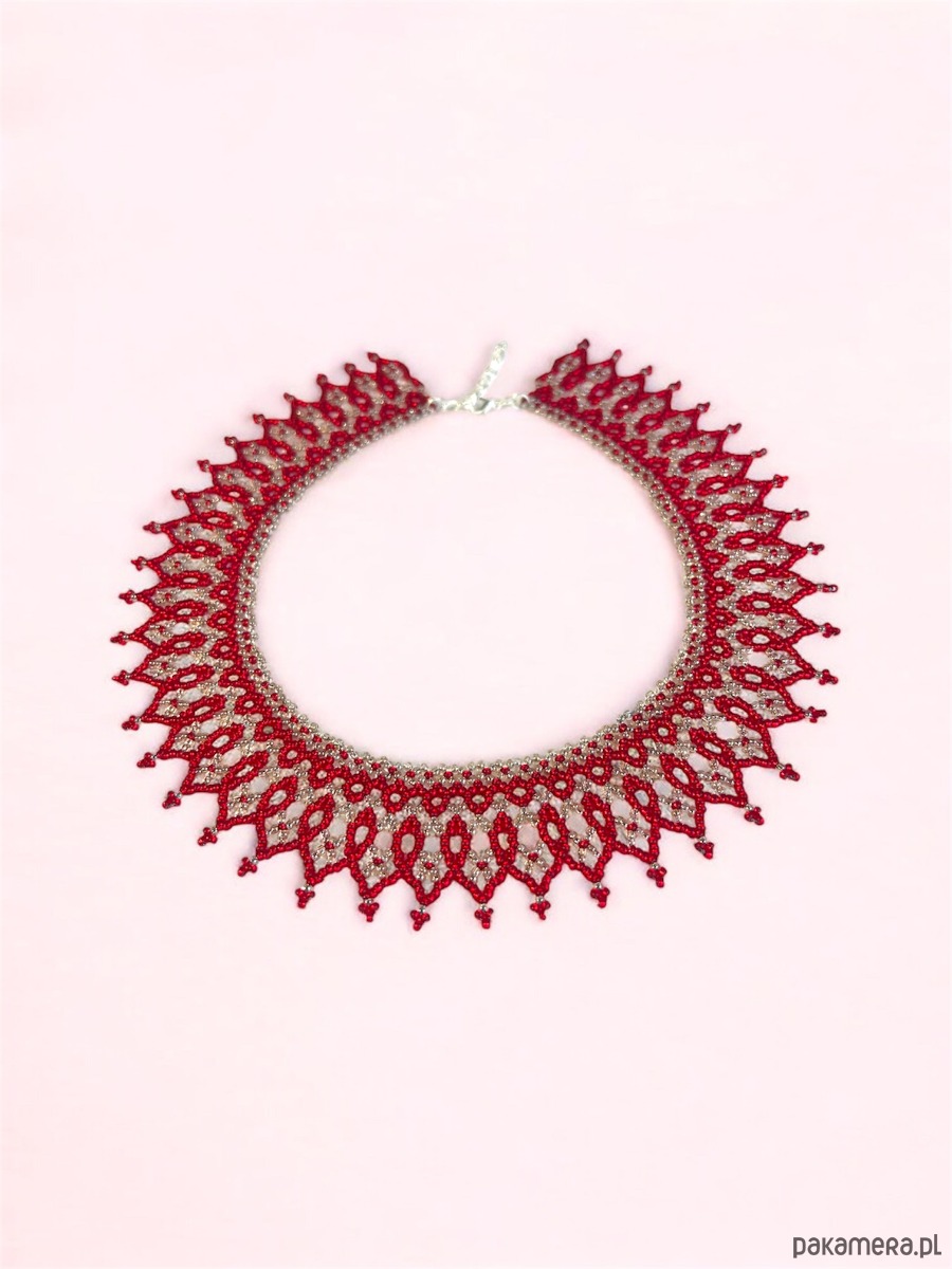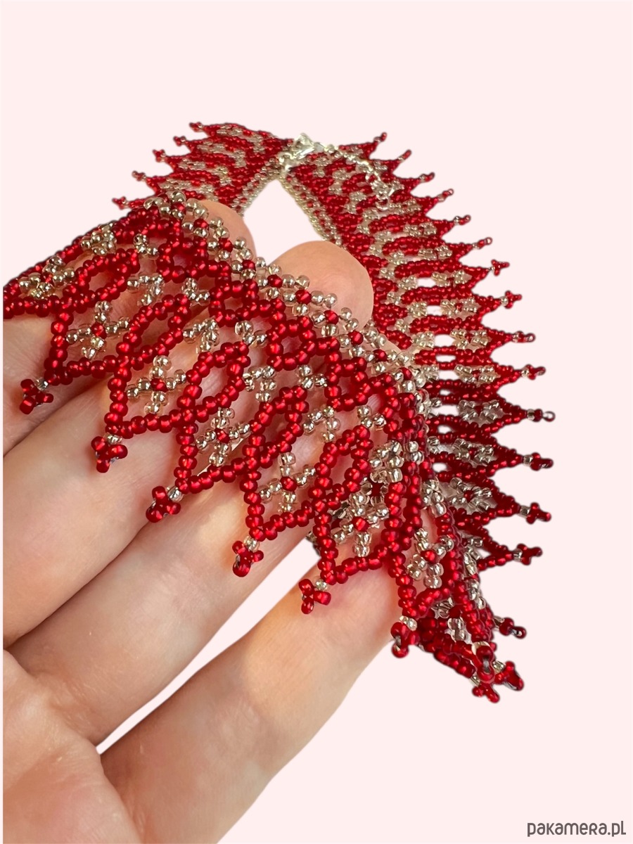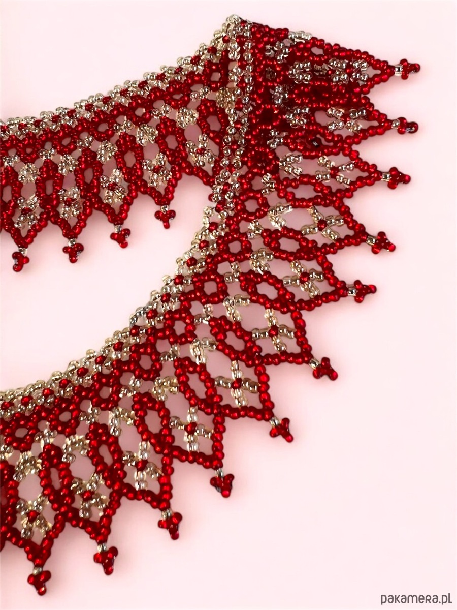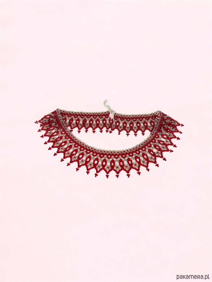 Ta Łemkowska krywulka – naszyjnik koralikowy handmade to wyjątkowy, ażurowy kołnierzyk z matowym czerwonym ornamentem na transparentnym tle. Wyjątkowa biżuteria o unikalnych kolorach i ponadczasowym charakterze.
