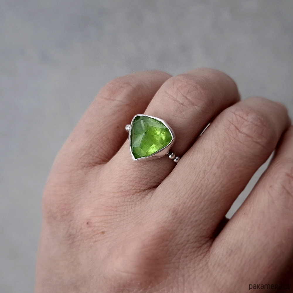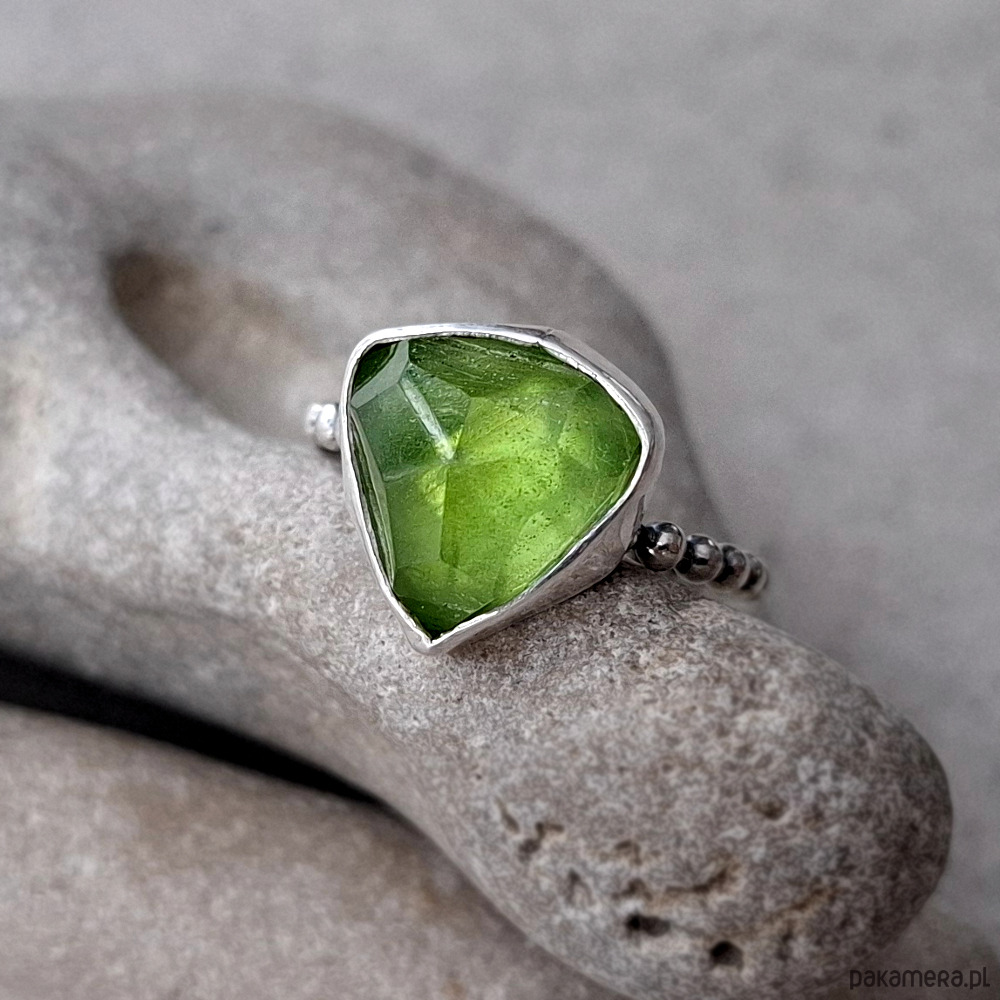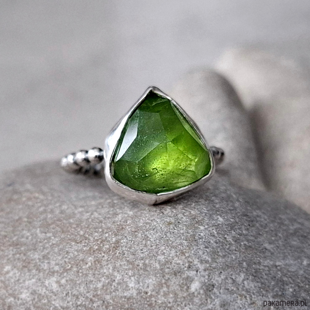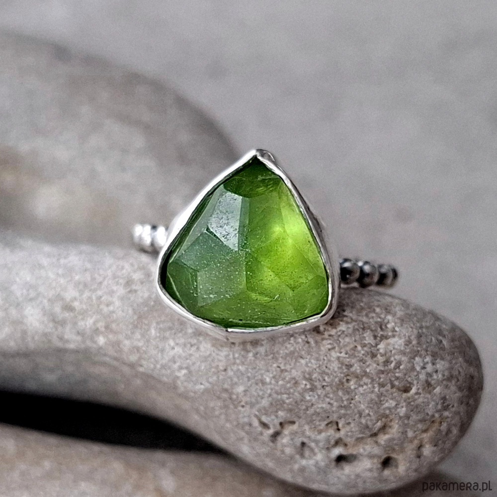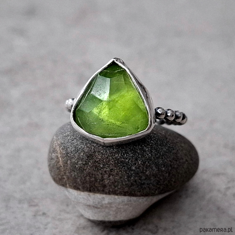 Delikatny, srebrny pierścionek ozdobiony fasetowanym zielonym peridotem. Korona pierścionka została osadzona na delikatnej ozdobnej obrączce. Całość wykonana ręcznie ze srebra 925 w jednym niepowtarzalnym egzemplarzu. Wymiary korony pierścionka: ok 14x14 mm. Rozmiar obrączki 14,5. Biżuteria zostanie ozdobnie zapakowana.