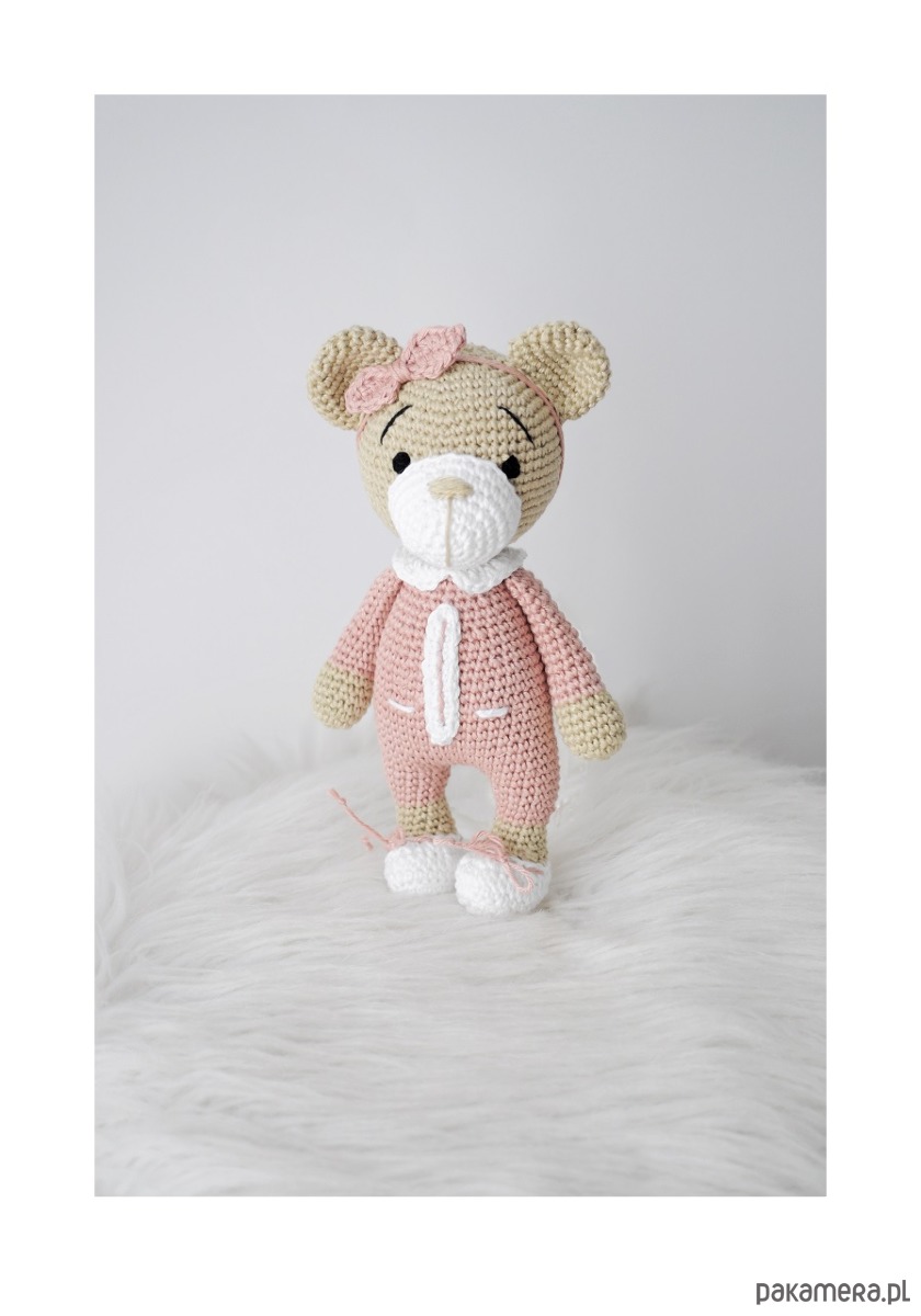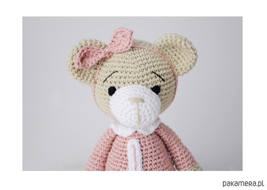 Leniuch ma ok. 19cm wzrostu i różowo-beżowe umaszczenie. Oczy i pyszczek są haftowane. Misia wykonano z bawełny, wypełnienie to puch antyalergiczny. Miś nie stoi samodzielnie.