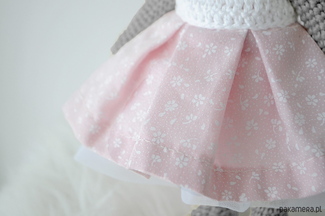 Materiał: bawełna, tiul (podszycie sukienki), puch antyalergiczny, satynowa wstążka (kokardka przy uchu)