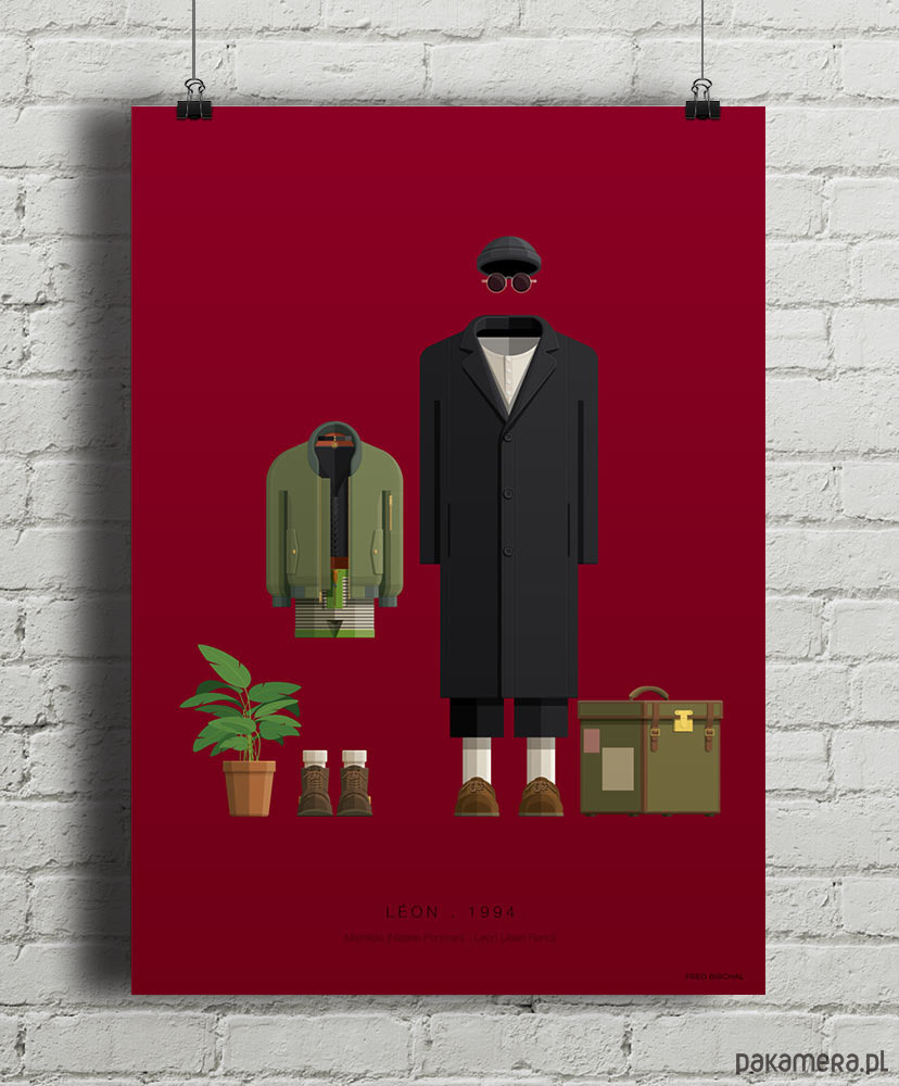 Plakat inspirowany filmem Leon zawodowiec, reż. Luc Besson. Energia filmu została tutaj oddana przez intensywny kolor tła, który wspaniale komponuje się z kostiumami postaci na planie głównym. Grafika pokazuje stroje dwóch głównych postaci. Płaszcz, przykrótkie spodnie i nieodłączne okulary lenonki spoglądające spod czarnej czapki - to atrybuty tytułowego Leona, którego w filmie doskonale zagrał Jean Reno. Zielona kurtka, materiałowe krótkie spodenki w stylu lat 70-tych i krótka koszulka - to oczywiście Matylda, rola, w której genialnie zadebiutowała Natalie Portman.