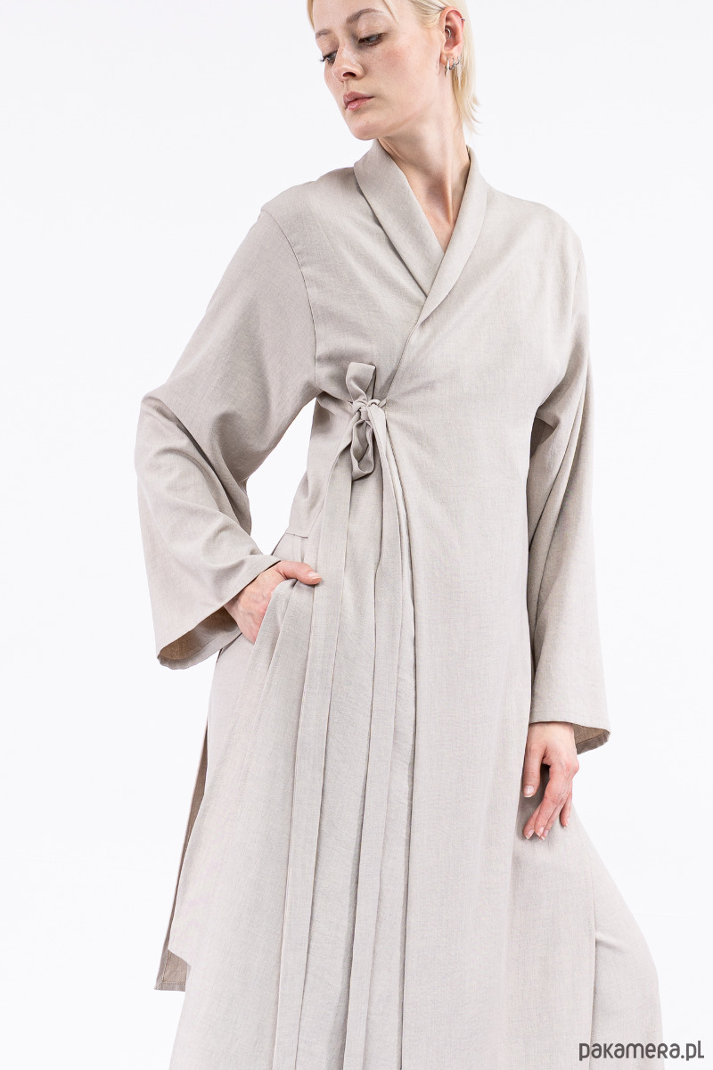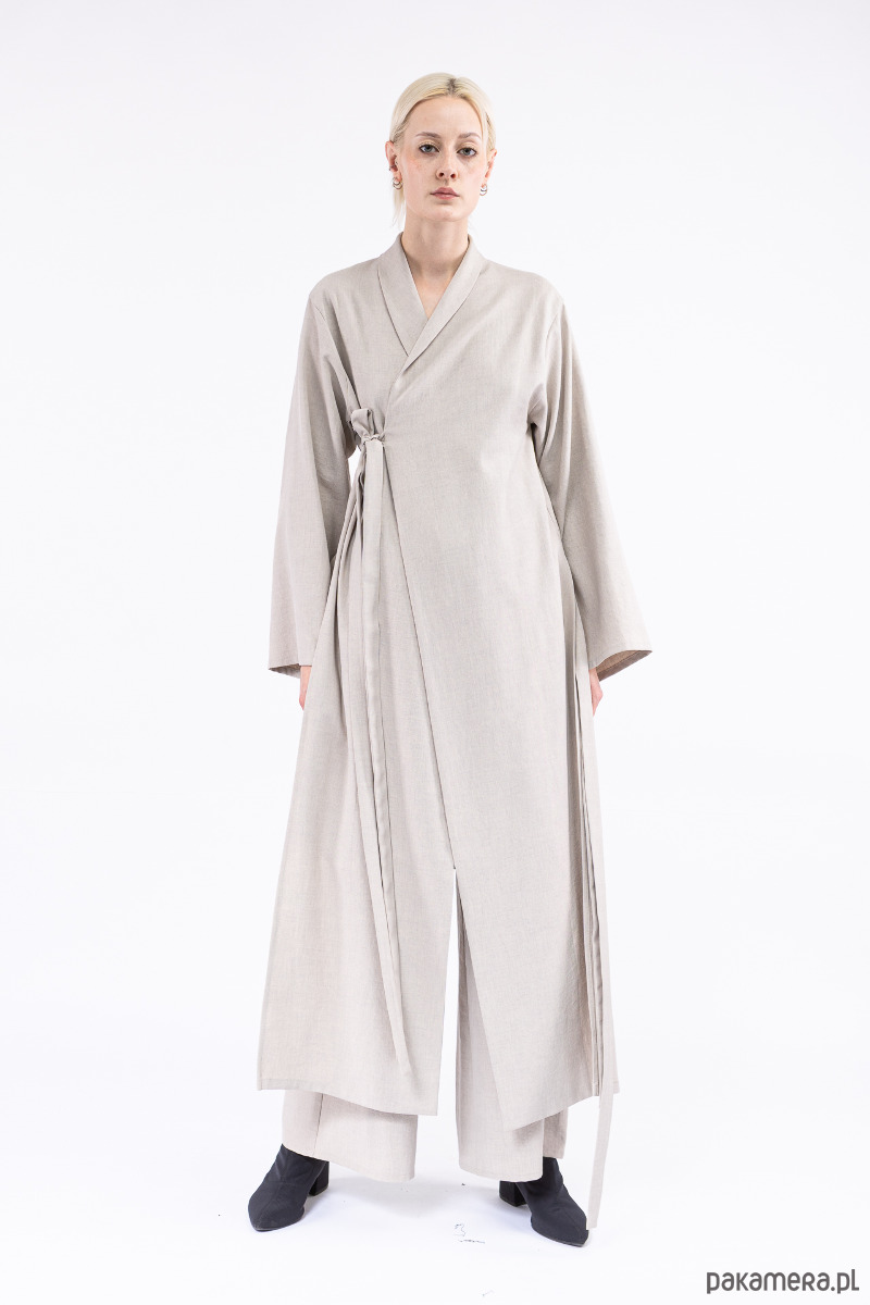 płaszcz długi z rozcięciami po bokach, z krótkim tyłem, szerokimi rękawami, przewiązany paseczkiem
