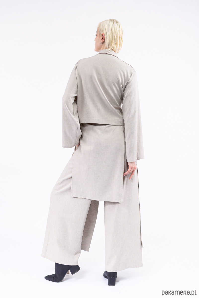 zestwiony ze spodniami RUTE TROUSERS z szerokimi nogawkami, dopasowanymi w talii zaszewkami, kryty suwak z tyłu, kieszenie w bocznych szwach z dodatkową nakładką, stąd efekt wielowarstwowości setu